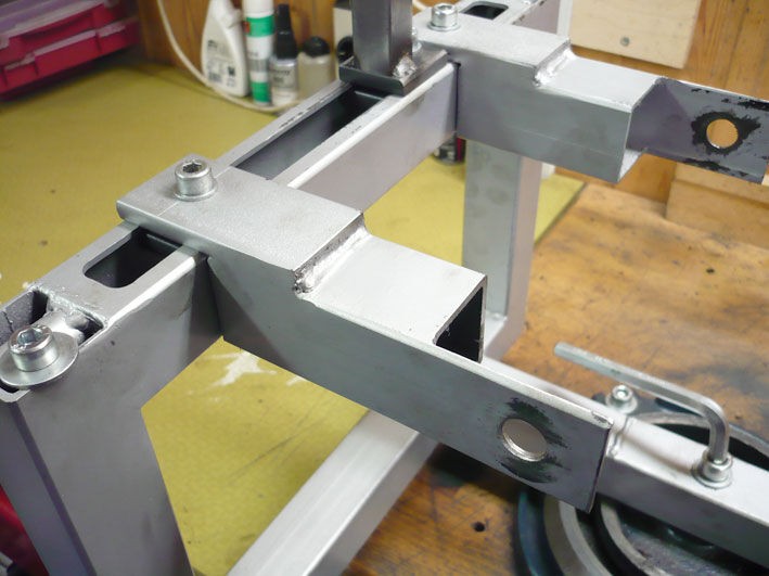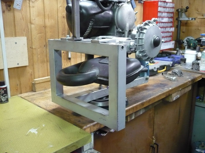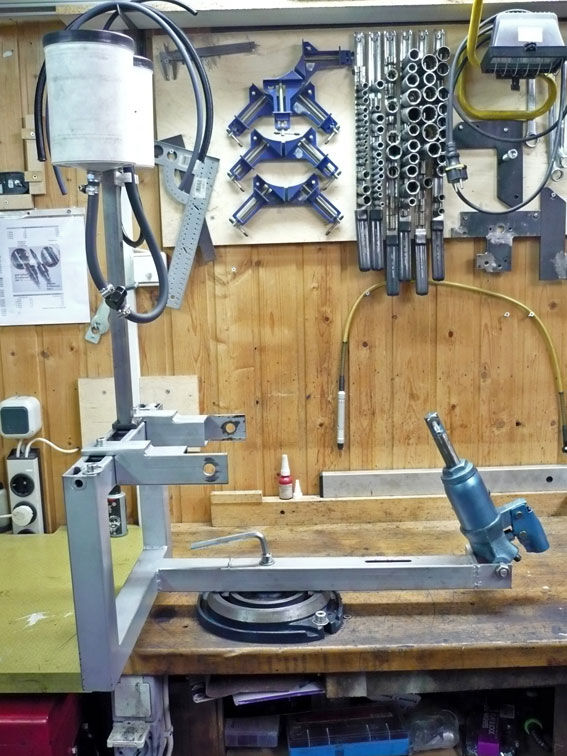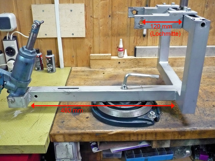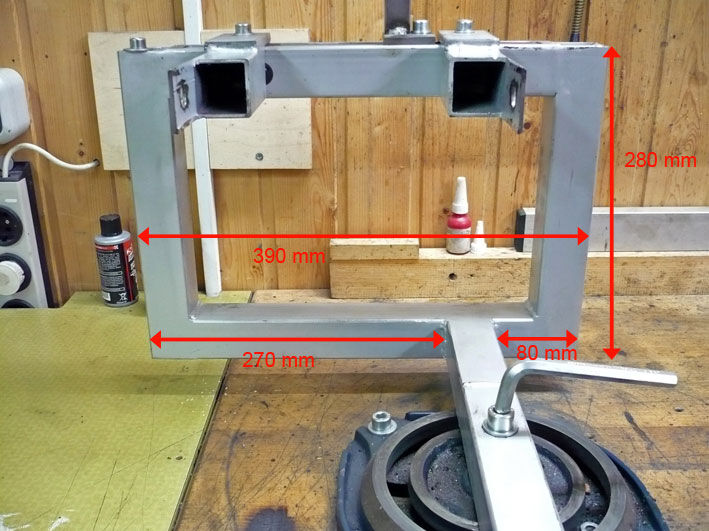 Die Vierkantrohre sind 40x40mm und der Hydraulikstempel ist aus einem zerpflückten Standard-Wagenheber, den man für "Kleines" bei jedem Autozubehör bekommt. Ich habe den Stempel extra eingebaut, damit man das etwas flexibler auf verschiedene Motorgrößen einstellen kann, außerdem beim absenken für Bremstrommelausbau (letztes Bild) ganz praktisch.