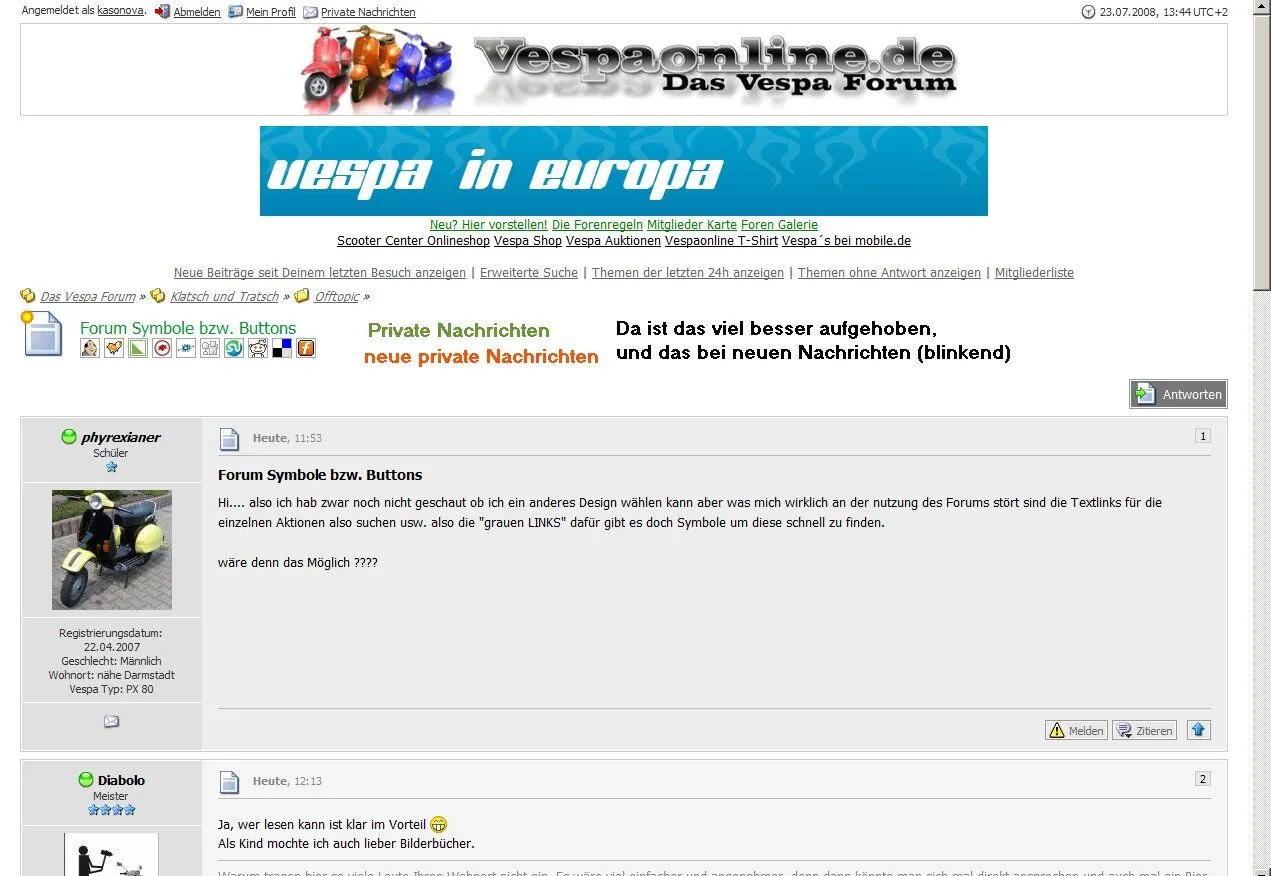 Hi.... also ich hab zwar noch nicht geschaut ob ich ein anderes Design wählen kann aber was mich wirklich an der nutzung des Forums stört sind die Textlinks für die einzelnen Aktionen also suchen usw. also die "grauen LINKS" dafür gibt es doch Symbole um diese schnell zu finden.