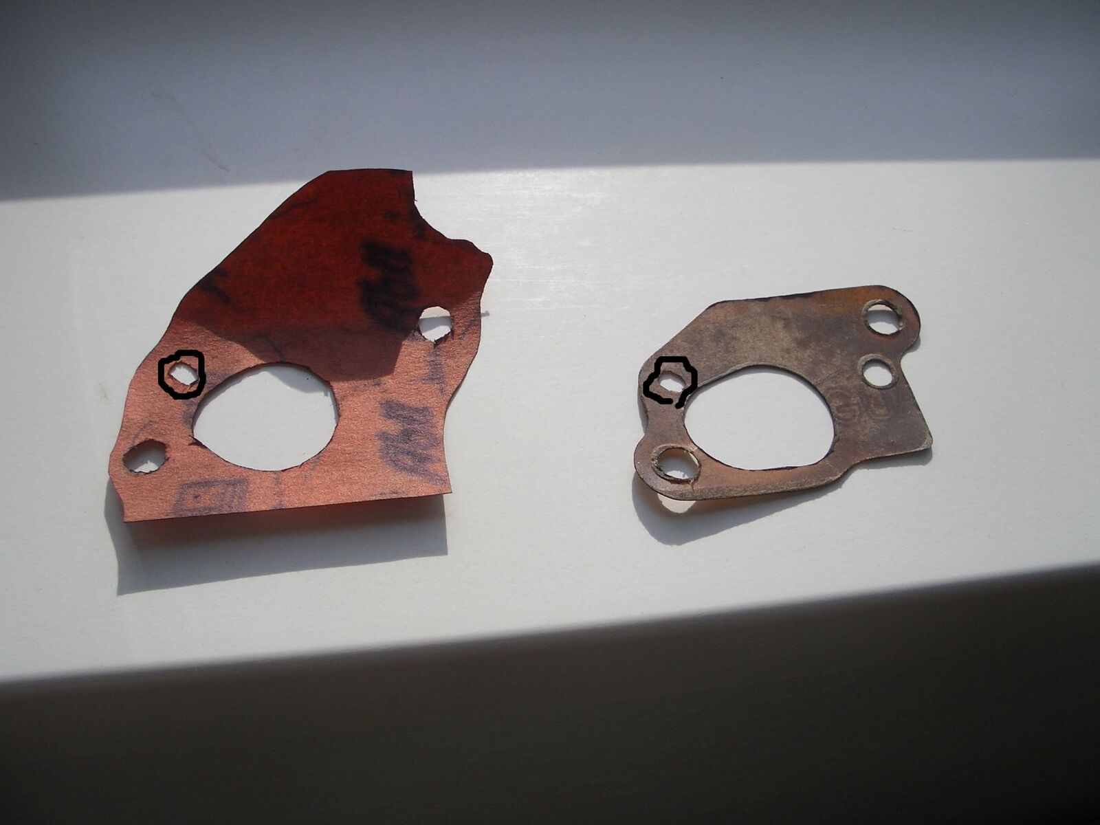 Hab die beiden Originaldichtungen mal als Bild angehängt. Mir ist da nämlich aufgefallen, dass die Aussparung, welche ich schwarz umradet habe scheinbar keine Funktion hat.