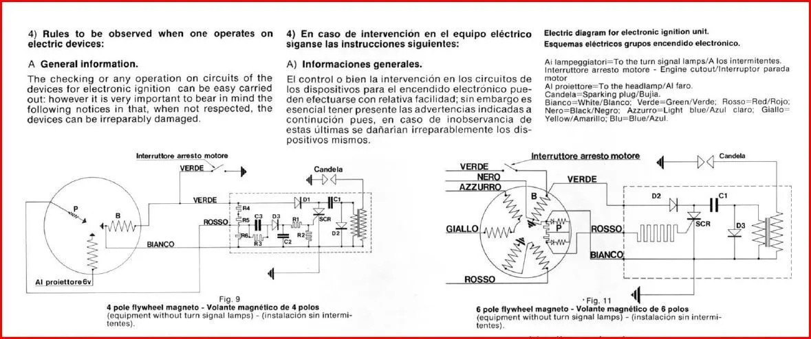 Die mit "C" bezeineten Bauteile sind Condensatoren, mit "D" sind Dioden bezeichnet, mit "R" werden Widerstände bezeichnet und "SCR" bezeichet einen Thyristor Triac etc. Die eigenliche Zündspule liegt jeweils ganz rechts und mit "Candela" ist die Zündkerze gemeint.
