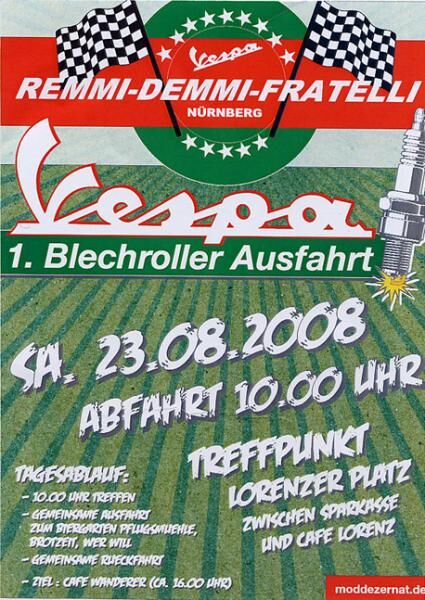 am 23.08.2008 wird eine Vespa Ausfahrt in Nürnberg veranstaltet. Ziel der Ausfahrt ist der Biergarten "Pflugmühle" bei Schwabach. Treffpunkt ist 10 Uhr am Lorenzer Platz (siehe Anhang) Wäre schön wenn der ein oder andere von euch erscheint. ![]()