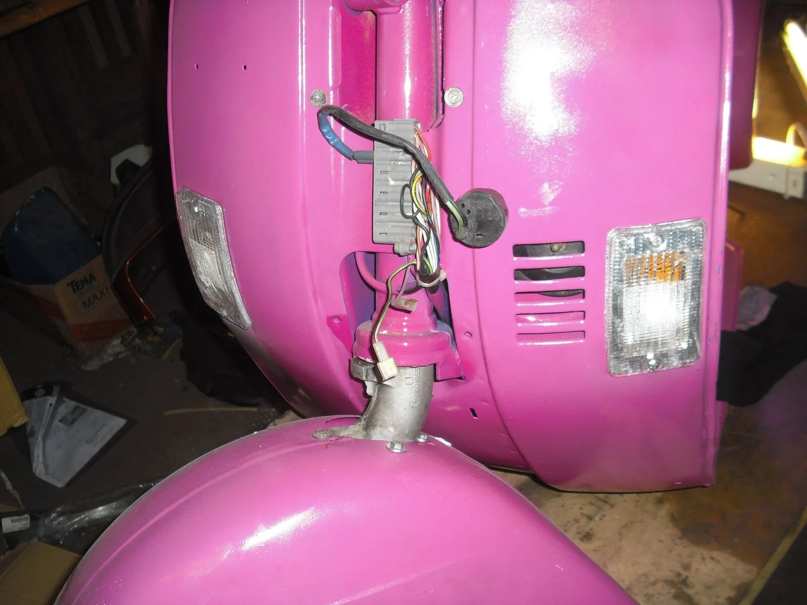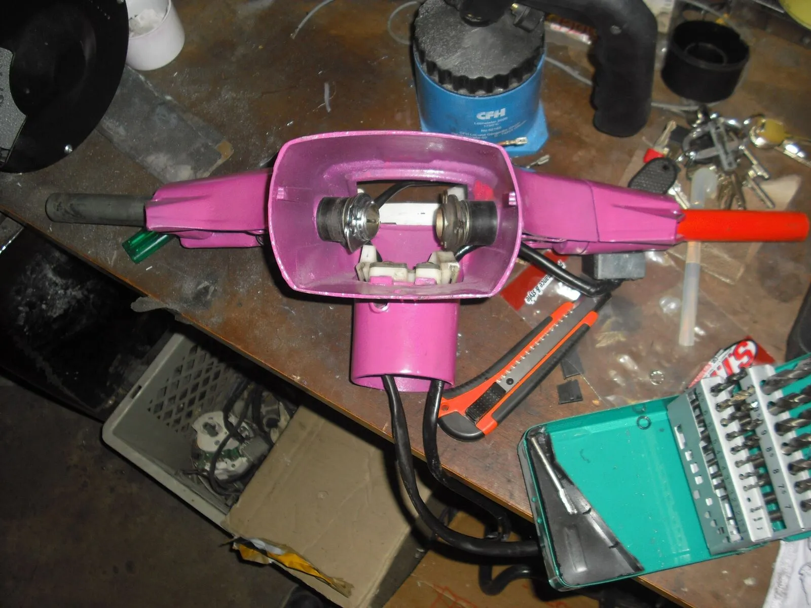 Lenkkopf mit neuem Blinkerschalter und rechts den typischen PK Schalter, die Stecker musste ich auf beiden Seiten ziemlich runterschleifen, damit sie durch die kleinen Öffnungen mit Speziallenkkopf passen.