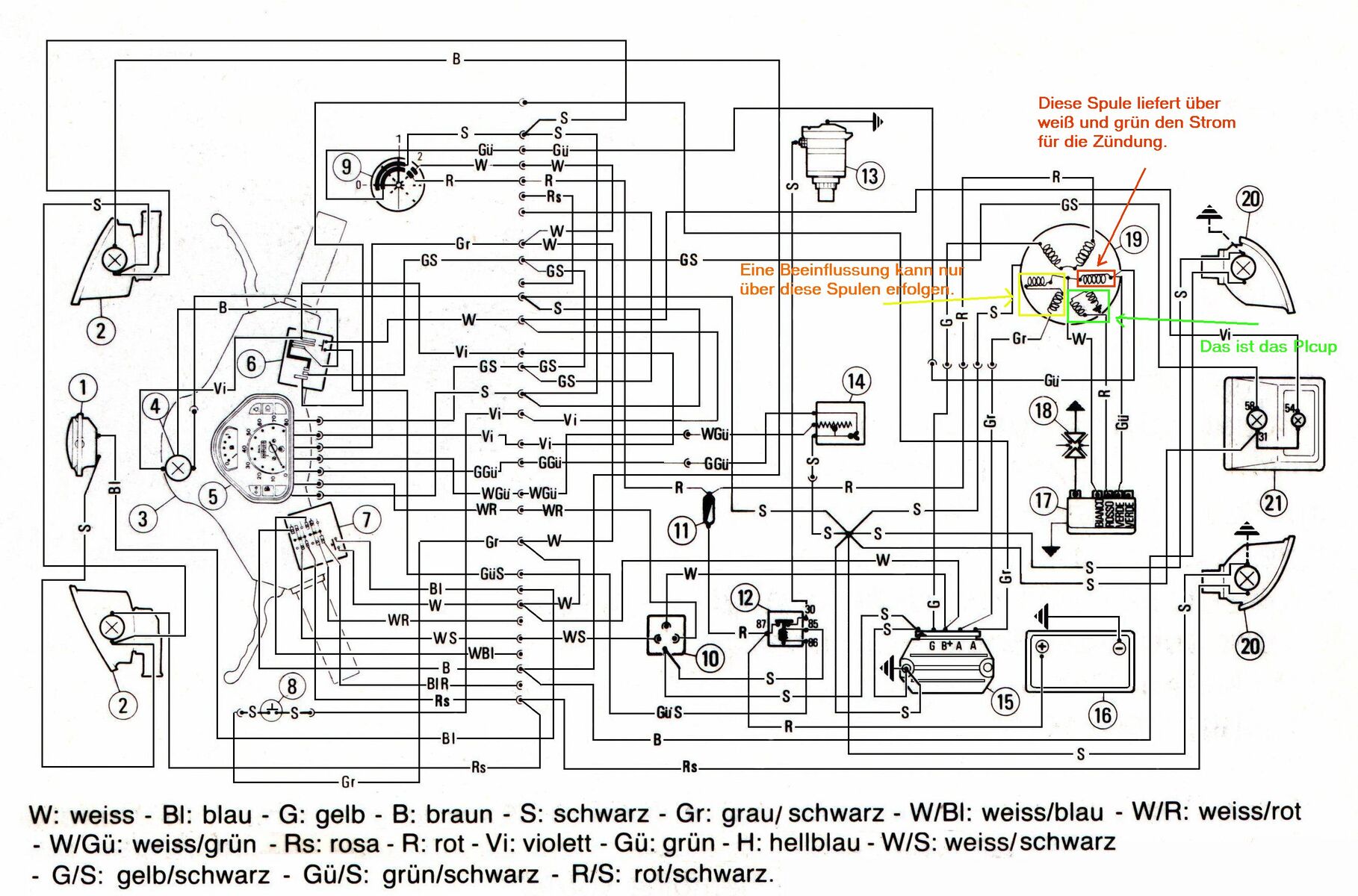 Also, zuerst einmal habe ich die Kerze, Zündstecker und Kabel erneuert, Gemisch und Leerlauf eingestellt - sie springt sofort an und läuft recht rund. Doch wenn ich fahre, ist bei 25 km/h Schluß und selbst erst mal auf diese Geschwindigkeit zu kommen, dauert eine Weile - sie dreht dann allerdings auch nicht auf vollen Touren - selbst im Stand bekomme ich sie nicht auf Volllast. Was zu beobachten ist, wenn ich die 25 km/h erreicht habe, und das Licht anschalte, geht sie runter auf 15 km/h.