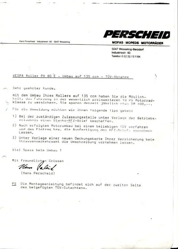 Vor einiger Zeit habe ich bei der Fa. ZMG Zimmermann Motorsport in Empfingen einen Umbaukit für die PX 80 auf 125 ccm . (mit TÜV-Gutachten, Preis 499.00 DM)