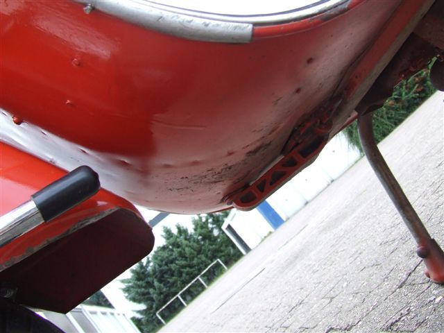 Auf der negativen Seite: Motor ölt (tropft am Auspuff runter?), ziemlich oft und schlecht ausgebesserter O-Lack, Beinschild wurde wohl mal im oberen Bereich gerichtet (sieht man wenn man schräg drauf guckt) und das Schlitzrohr ist auch ziemlich verhurt, Rücklicht und Blinkergläser sind gesprungen.