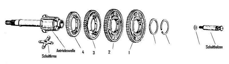 Kommt nicht zuerst das grösste Ritzel = 1. Gang voran auf die Welle?