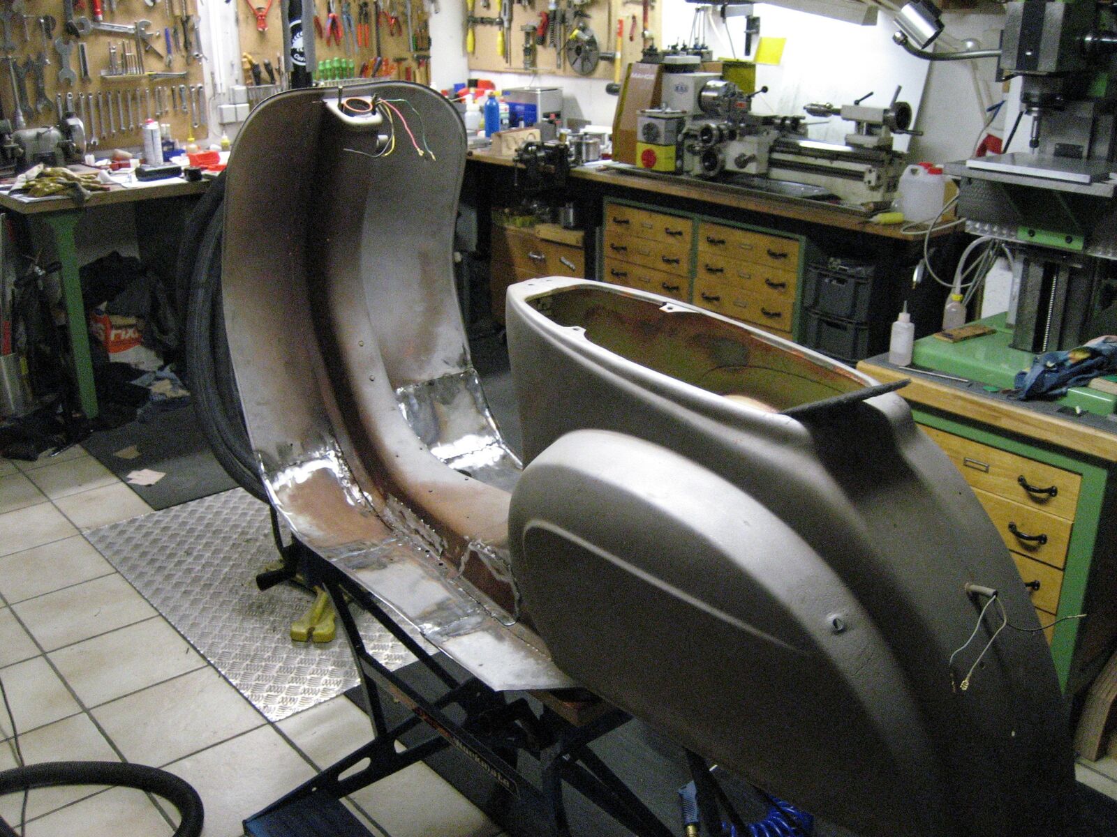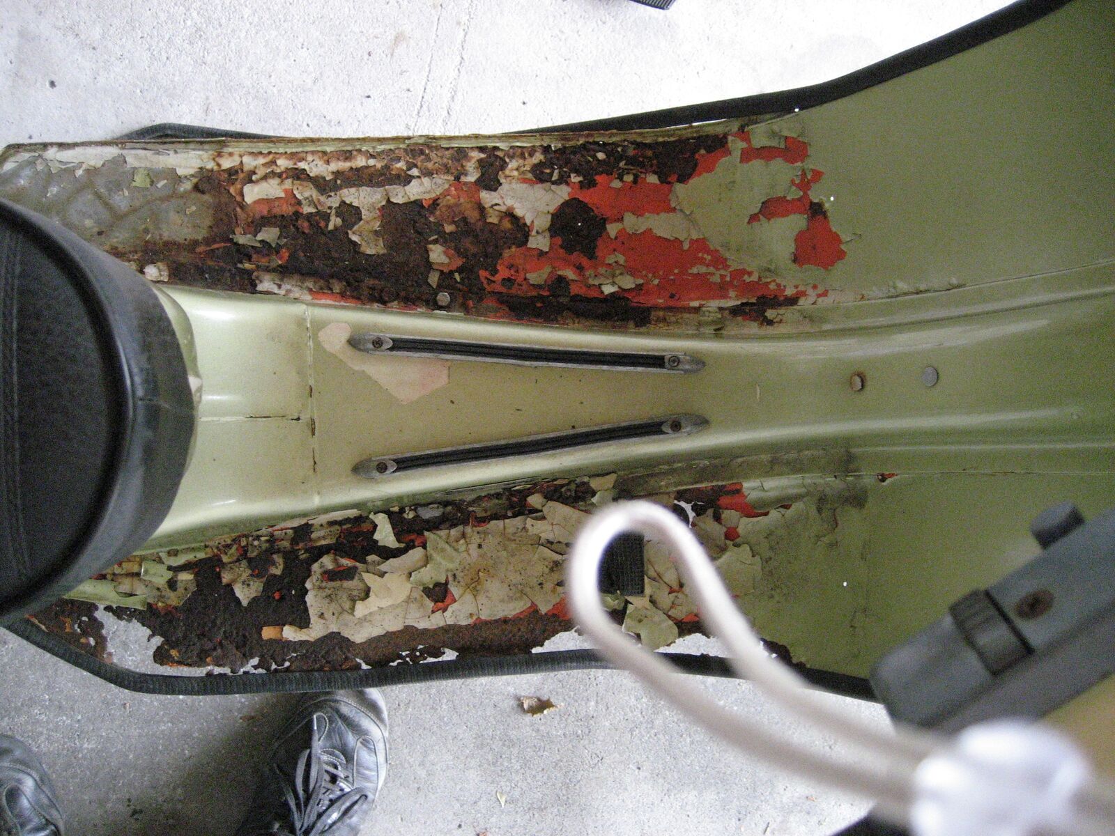 Ich will jetzt nicht deine Arbeit runtersprechen, aber das hättest Du doch besser gekonnt! Mit dem Schweißgerät kannst Du ja offensichtlich umgehen. Die aufgesetzten Flicken am Rahmentunnel sind echt schlecht. Das Reprotrittblech kostet 70 Euro und passt besser als das selbst gedengelte Ding.
