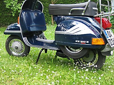 EIne PX 200 E Lusso, Bj. 97, 8tkm (ehrliche), Zustand techn. und optisch 1 a (stand nur in der Garage). Verliert aber etwas Öl...soll am poösen Tank liegen.
