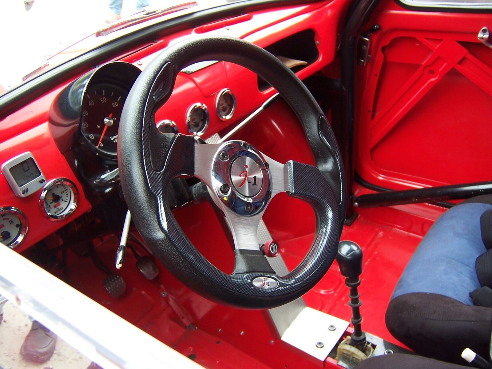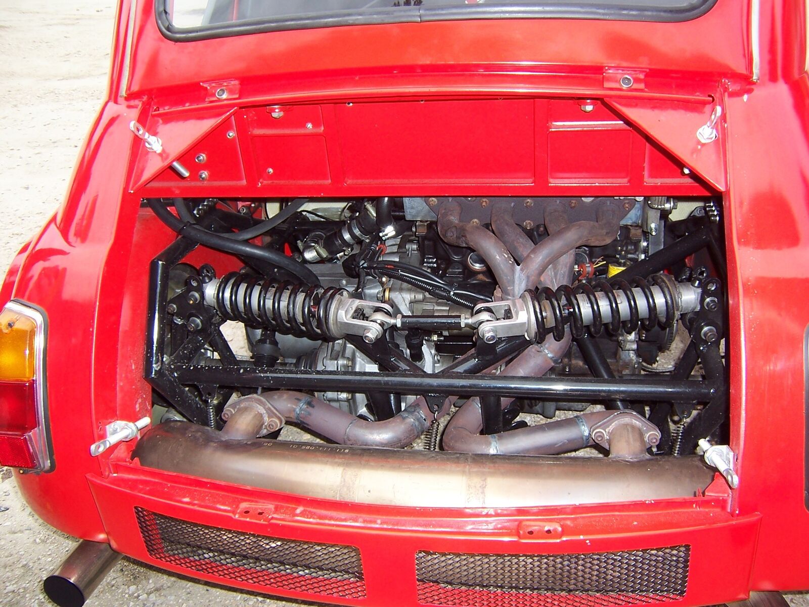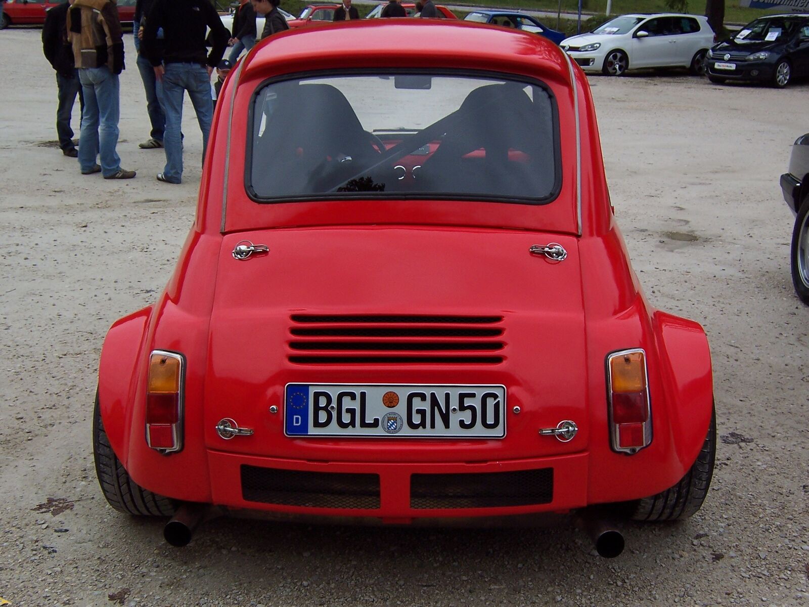 So,habe heute den Typ mit der rasenden Knutschkugel getroffen und nochmals Bilder gemacht bzw. ihn zu dem Gerät ausgefragt.Fahrzeug ist und war ein Steyr Puch Bj.1957(steht auch noch so in den Papieren).Motor ist ein frisierter(Kolben und Pleuel sind geschmiedete Teile,größere Ventile,schärfere Nockenwelle,polierte Ansaugkanäle) Sauger von einem Renault Megane.Das Getriebe original von selbigen.Die Antriebswellen auch,wurden aber gekürzt und nach vorheriger Materialanalyse wieder zusammengeschweißt.Die Bremsanlage ist komplett auch vom Renault Megane.Die Auspuffanlage bis auf den Topf(von Porsche)ist Eigenbau.Ebenso das Fahrwerk mit Pushupdämpfer(Stoßdämpfer,Uniballanlenkungen und ein paar Schrauben sind"Stangenware").Hauben(vorne und hinten),Dacheinsatz(Rolldach),Kotflügel(Seitenwand) hinten,Frontmaske mit vorderen Kotflügeln(sind ein Teil)ist auch wieder Eigenbau aus Glasfiber.Der Motor bringt auf der Rolle eine Leistung von 190PS.Das Fahrzeug hat Vollgetankt ein Leergewicht von 700kg.Der ganze Spass hat dem Erbauer (reinen Materialwert)20000 Euro gekostet.Würde er pro Arbeitsstunde 10 Euro berechnen,so käme es auf ca. 80000 Euro.Das ganze ist TÜV abgenommen.Dieser war von Anfang an bei dieser Aktion eingebunden und hat Tipps und Hinweise mit eingebracht.