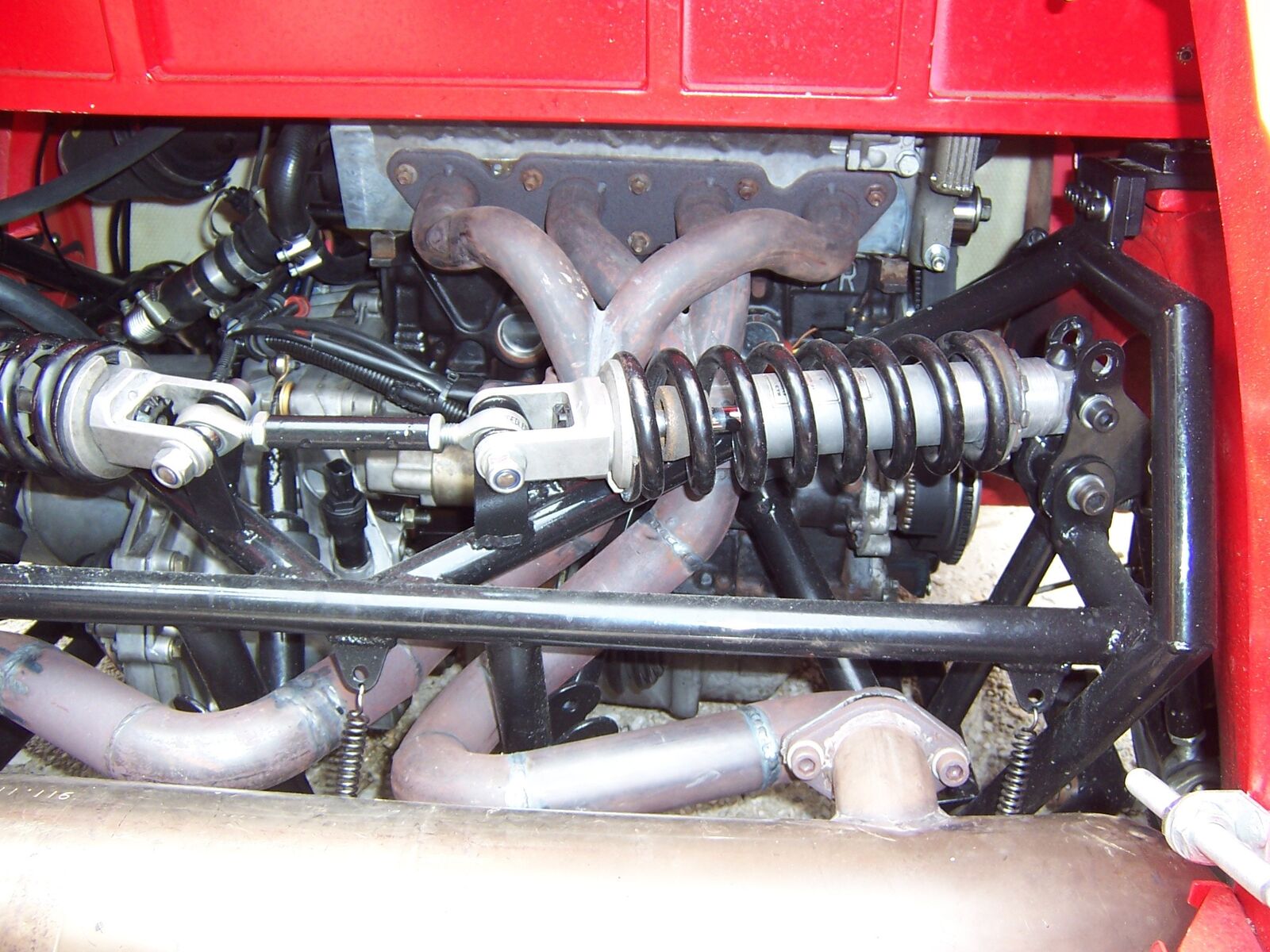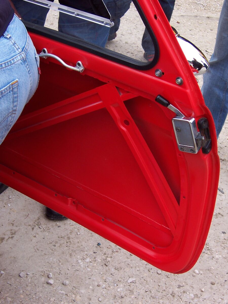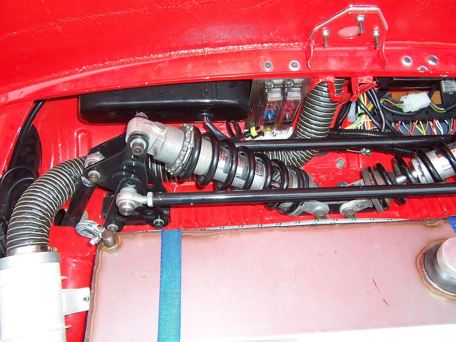 So,habe heute den Typ mit der rasenden Knutschkugel getroffen und nochmals Bilder gemacht bzw. ihn zu dem Gerät ausgefragt.Fahrzeug ist und war ein Steyr Puch Bj.1957(steht auch noch so in den Papieren).Motor ist ein frisierter(Kolben und Pleuel sind geschmiedete Teile,größere Ventile,schärfere Nockenwelle,polierte Ansaugkanäle) Sauger von einem Renault Megane.Das Getriebe original von selbigen.Die Antriebswellen auch,wurden aber gekürzt und nach vorheriger Materialanalyse wieder zusammengeschweißt.Die Bremsanlage ist komplett auch vom Renault Megane.Die Auspuffanlage bis auf den Topf(von Porsche)ist Eigenbau.Ebenso das Fahrwerk mit Pushupdämpfer(Stoßdämpfer,Uniballanlenkungen und ein paar Schrauben sind"Stangenware").Hauben(vorne und hinten),Dacheinsatz(Rolldach),Kotflügel(Seitenwand) hinten,Frontmaske mit vorderen Kotflügeln(sind ein Teil)ist auch wieder Eigenbau aus Glasfiber.Der Motor bringt auf der Rolle eine Leistung von 190PS.Das Fahrzeug hat Vollgetankt ein Leergewicht von 700kg.Der ganze Spass hat dem Erbauer (reinen Materialwert)20000 Euro gekostet.Würde er pro Arbeitsstunde 10 Euro berechnen,so käme es auf ca. 80000 Euro.Das ganze ist TÜV abgenommen.Dieser war von Anfang an bei dieser Aktion eingebunden und hat Tipps und Hinweise mit eingebracht.