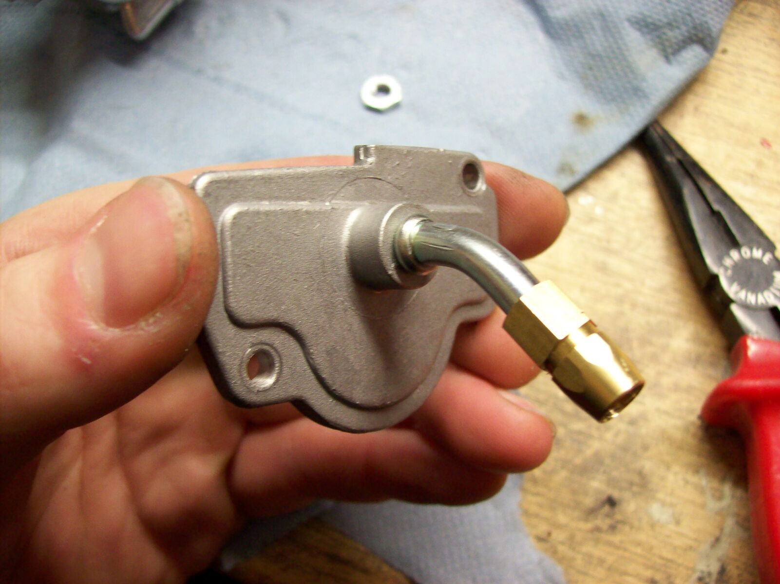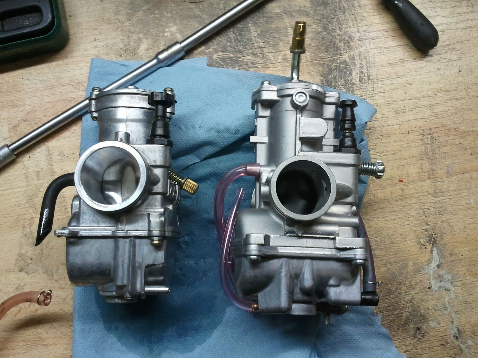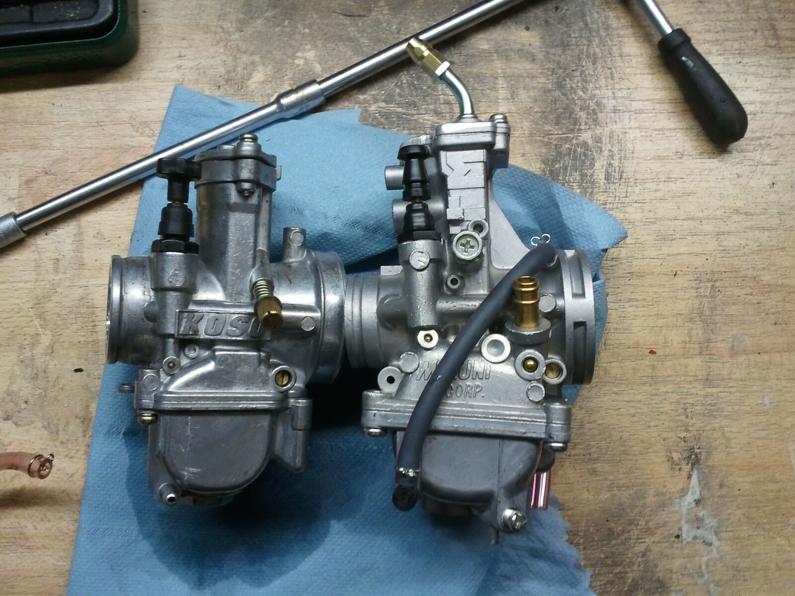 Sodala, nun ist der andere Bogen in dem Deckel. Ein wenig gekürzt, Gewinde geschnitten und Gasseil verbaut. Beim 2mal Kicken (mit Choke) angesprungen. Und wenn man an der Einstellschraube dreht, passiert auch was. Nicht so wie beim Koso!!!! ![]()