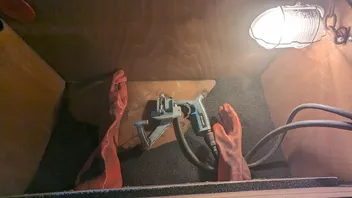 Damit habe ich von beiden Projekten die Bremspedale gestrahlt. Beim Kumpel war noch Lack von der "professionellen Lackierung" drauf. Bei mir nur Jahrzente alter Schmodder. Zuvor wurde beide im Teilewäscher gereinigt.