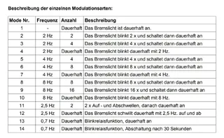 Dies kann man "programmieren" wie es beim Bremsen aufleuchten soll. Aktuell ist 4x Blinken in 2hz und dann dauerhaft leuchten.
