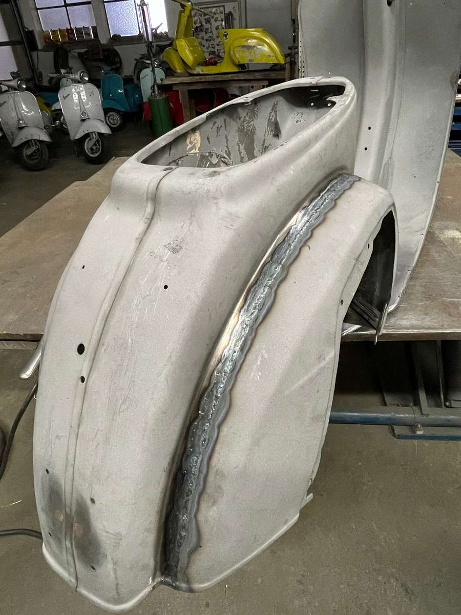 Es wird ein Rundumsorglospaket gemacht. Löcher zugeschweißt, Seitenbacken repariert, versteift und verbreitert und danach ausgedengelt und verzinnt soweit es geht. Damit so wenig wie möglich Spachtelmasse drauf muss... Beim Preis musste ich natürlich sauber schlucken, aber gut hilft ja nix