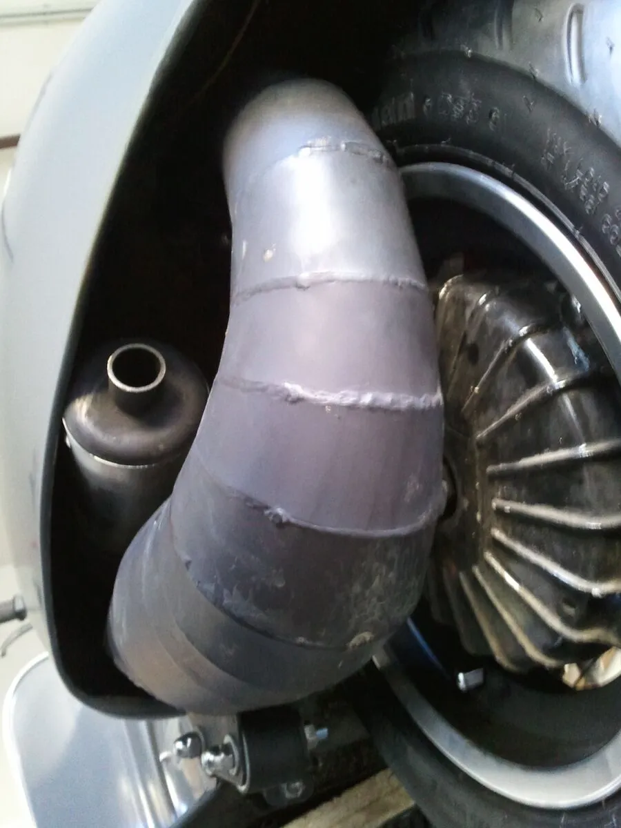 da der Dämpfer beim originalen Franz ein wenig zur Seite steht, werd ich diesen umschweissen und am Endrohr ein Bogen anschweissen, damit die Abgase nicht aussen auf den Körper prallen. Da sind schon wieder 10-15mm gerettet.