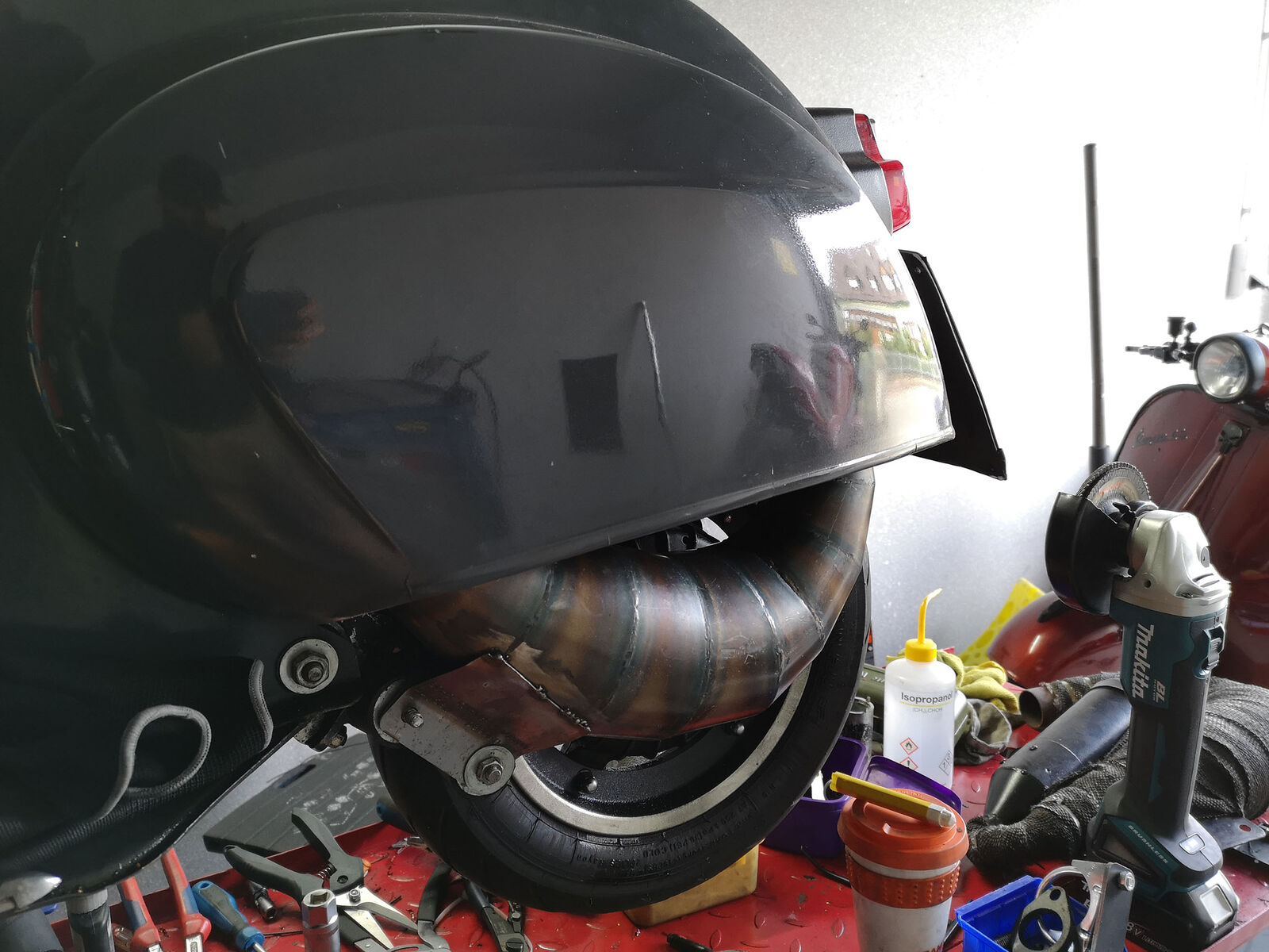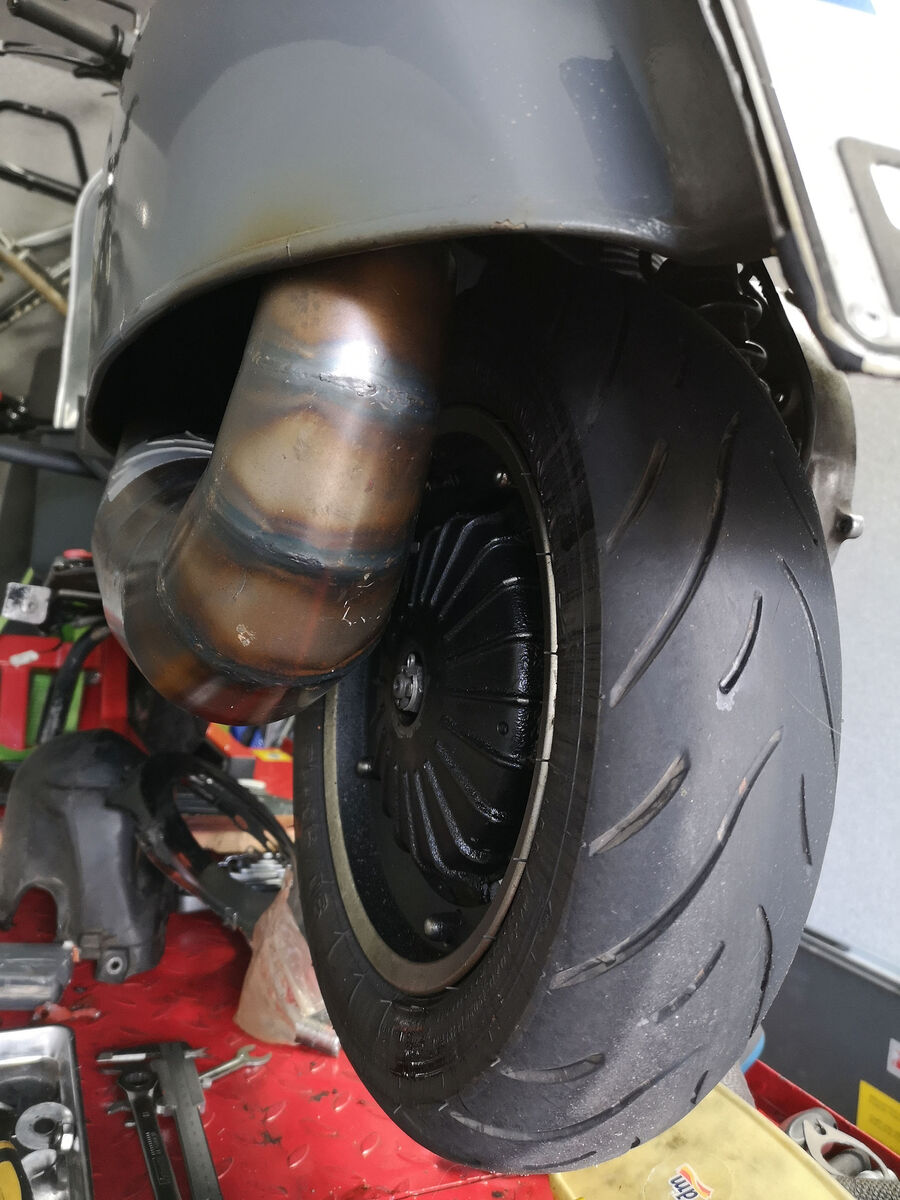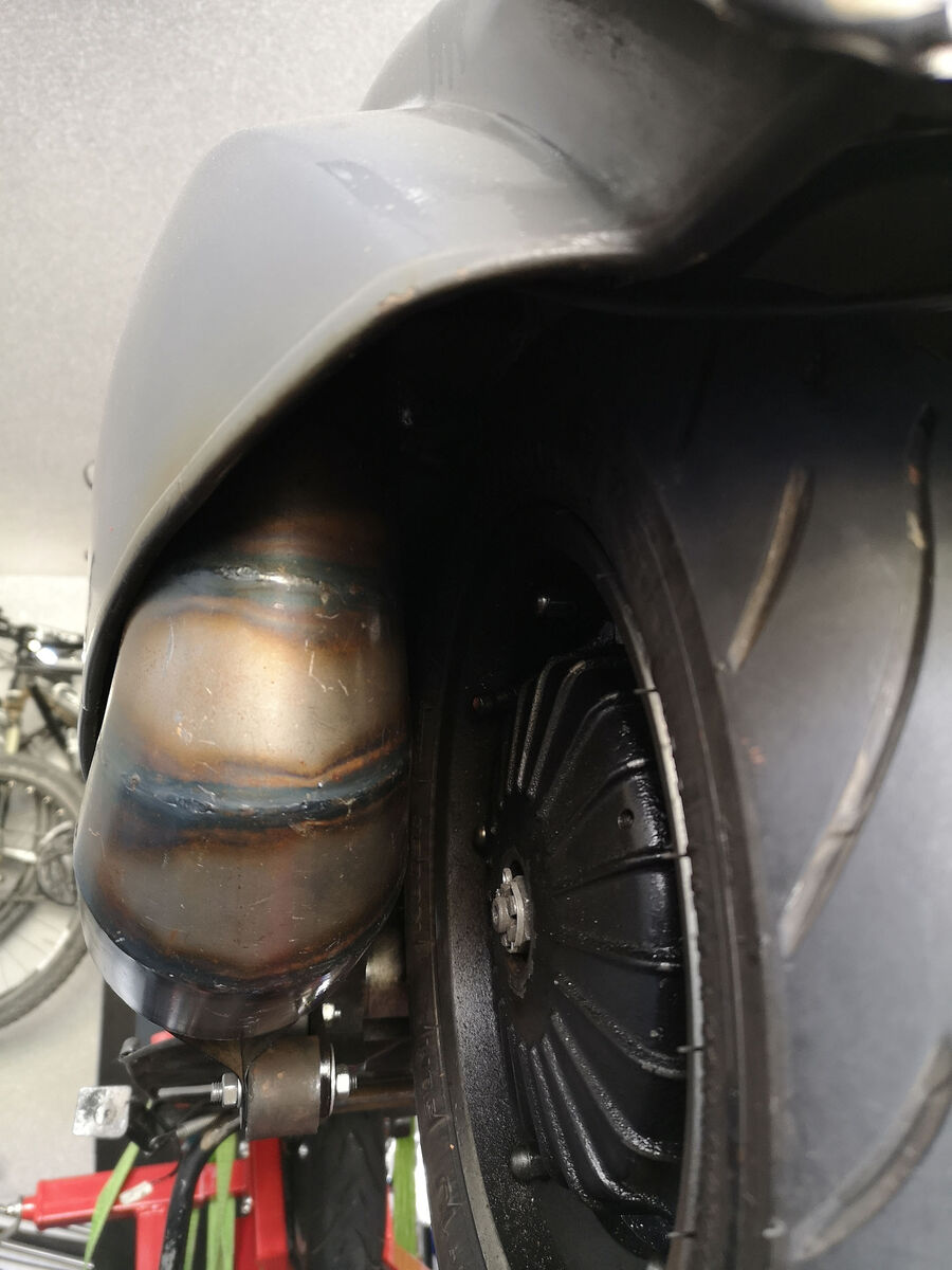 Flansch ist angeheftet und Auspuff sitzt soweit mal ganz gut. Einzig er kommt noch 5 mm weiter nach rechts Richtung Rad/Reifen.