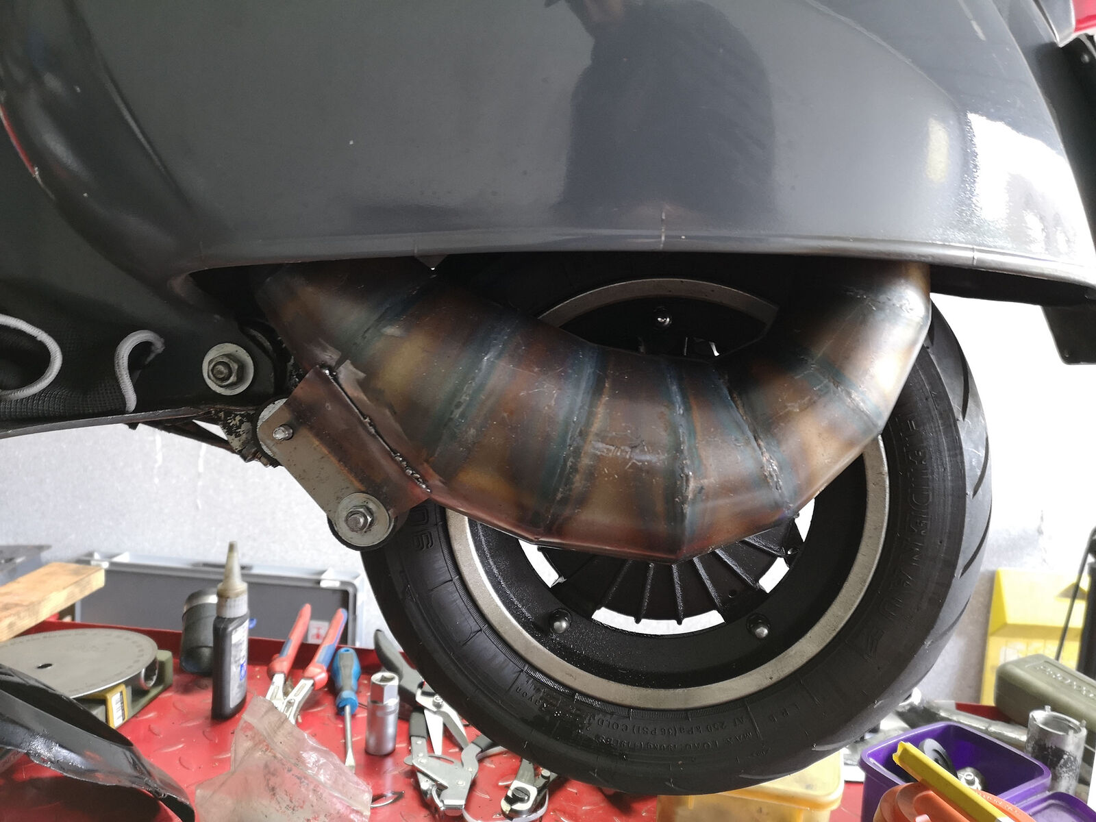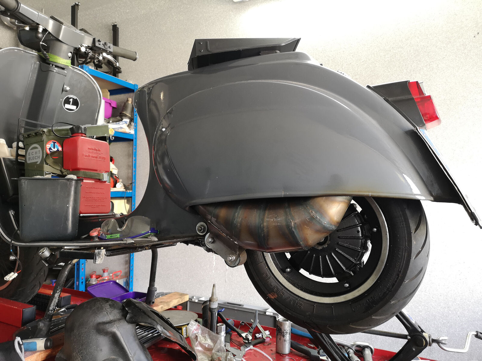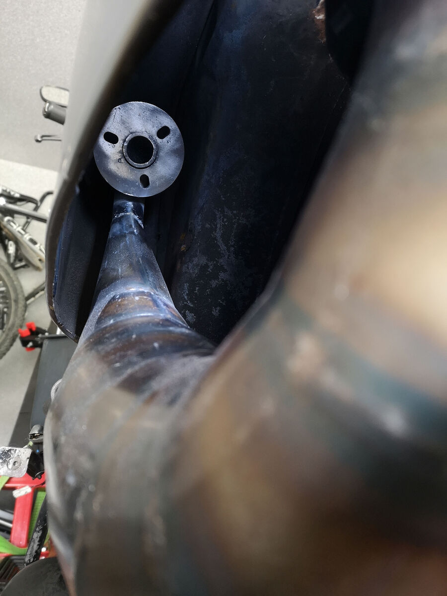 Flansch ist angeheftet und Auspuff sitzt soweit mal ganz gut. Einzig er kommt noch 5 mm weiter nach rechts Richtung Rad/Reifen.