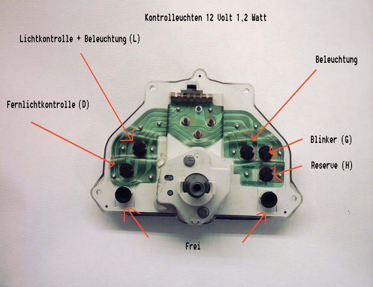 Hi, der ist im Lenker ausgehängt. Auf dem Bild, im gelben Kreis ist eine Rolle, in welcher der Zug eingehängt wird. Der Nippel des Zuges ist noch zu sehen. Und bevor weitere Fragen kommen, Demontage, erstens die Spiegel abschrauben. Dann alle 8 Schrauben in den roten Kreisen. Die in den grünen Kreisen bleiben drin. Dan kann man das Oberteil der Verkleidung etwas anheben. Nun muß noch die Tachospirale ausgehängt werden. Wenn Du von vorne über dem Scheinwerfer hinein schaust, siest Du in der Mitte den Tachoantrieb. Mit einem langen Schraubendreher o. Ä. die rechte oder linke Seite der befestigung zur Mitte drücken, dann kannst Du die obere Verkleidung abheben. Die elektrischen Anschlüsse des Tachos können dran bleiben. Wenn Du das schon auf hast, schau mal die beiden Birnen der Tachobeleuchtung nach. Die sind meistens durchgebrannt oder schon schwarz. Die vierkantige Fassung etwas drehen und raus heben. Die Birne ist dann nur eingesteckt. 12 Volt 1,2 Watt Glassockel.