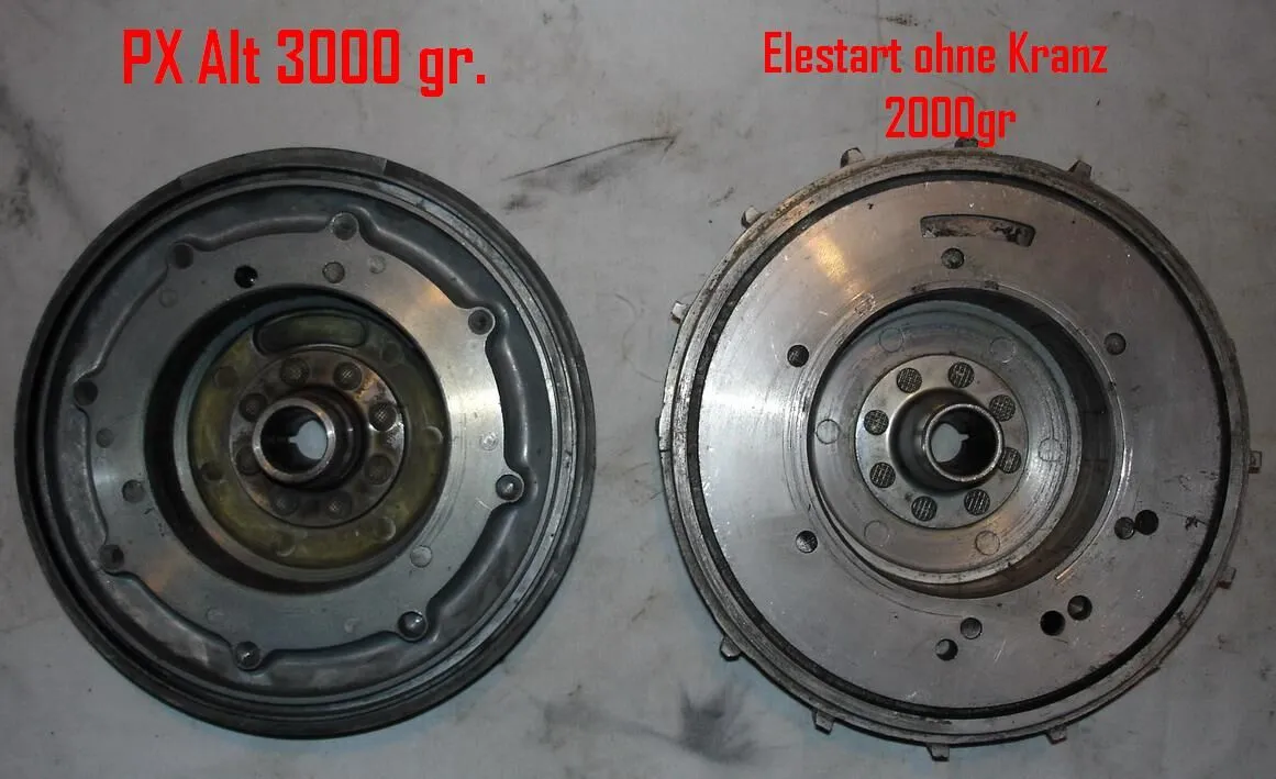 Die Leistungssteigerung liegt im Bereich von 1,5 PS. Ohne Lüfterkranz sind es nochmals 0.7PS mehr. Ob sich sowas bemerkbar macht hängt natürlich stark vom Rest des Motors ab. Ich meine, man merkt auf jeden Fall den Unterschied zwischen einem 1800PK Rad und einem Elestart Rad ohne Kranz. Vom originalem will ich hier gar nicht reden. Das HP4 ist da natürlich von der Masse her, das Beste was man dem Motor antun kann. Von allen anderen Betrachtungspunkten her, aber leider nicht. Die Qualität ist schlecht, der Wirkungsgrad der Lima verschlechtert sich dramatisch und der [lexicon='ZZP',''][/lexicon] neigt zum Wandern.