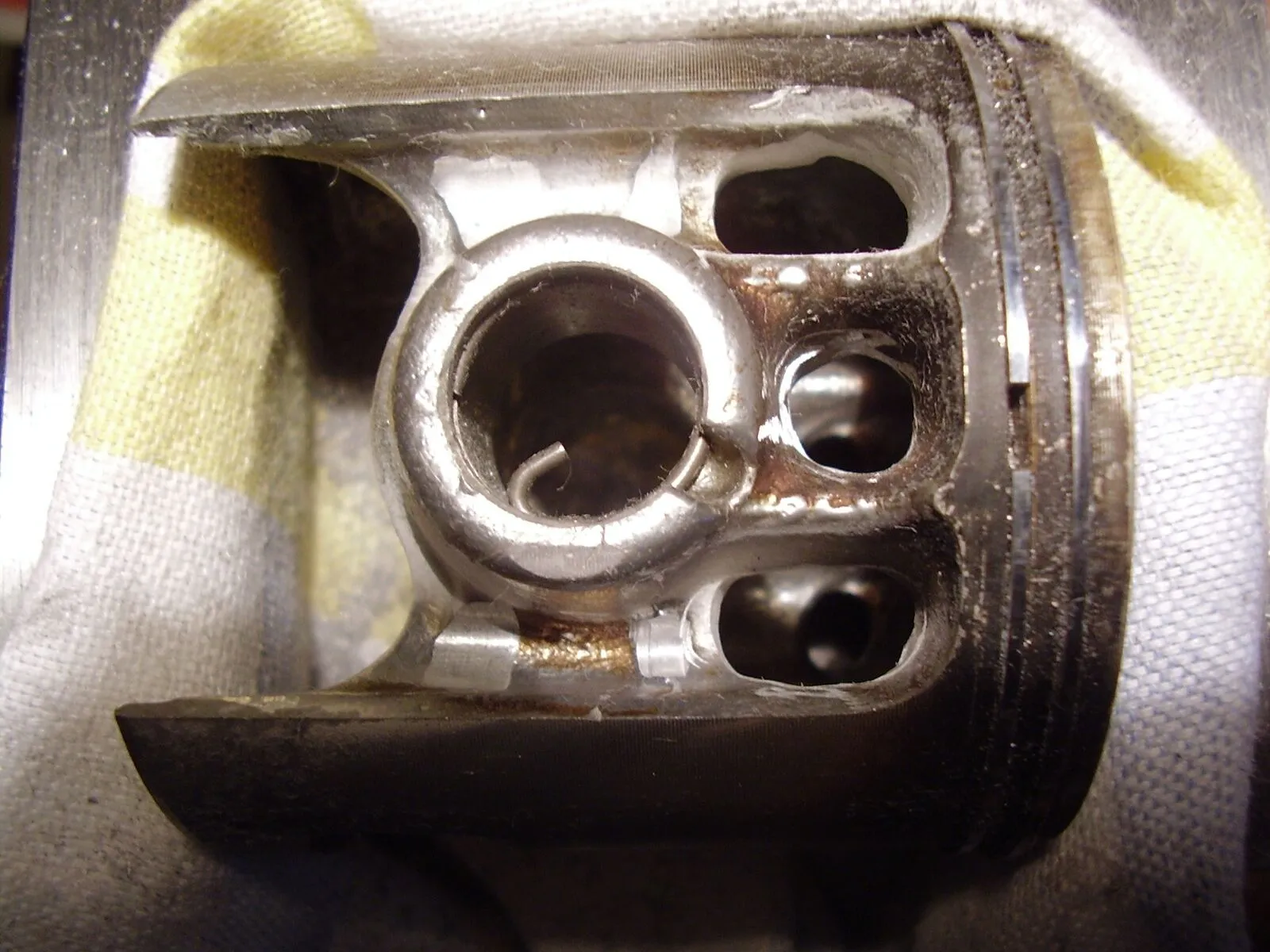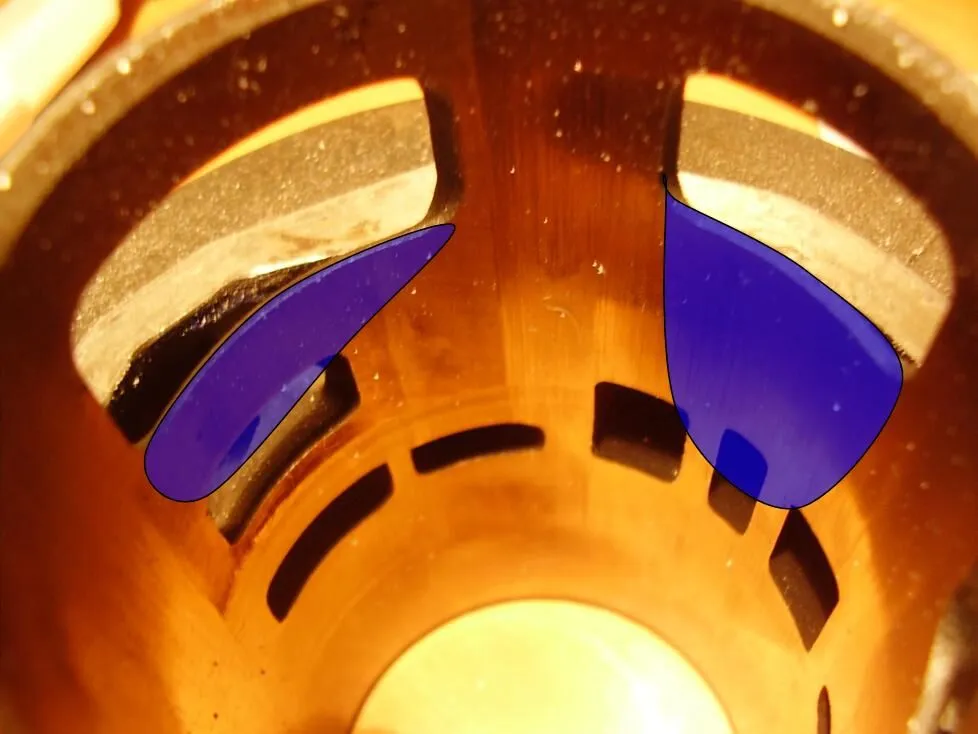 Das ist das Malossi CVF System. Der Vespamotor hat schlicht zu kleine Überströmkanäle. Wer schon Mal einen ordentlichen Zweitakter in den Händen hatte, sieht, das trotz Fräserei ein Vespamotoer nicht an die Querschnittsflächen andere Zweitakter herankommt. Das CVF System beinhaltet nichts anderes als die Erweiterung der Überströmer in den Kolben hinein. Diese werden in der Abwärtsbewegung des Kolbens durch die Öffnungen im Kolben gefüllt. Je größer sie sind, desto besser der Füllungsgrad.