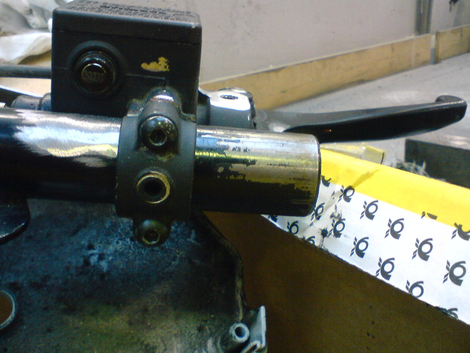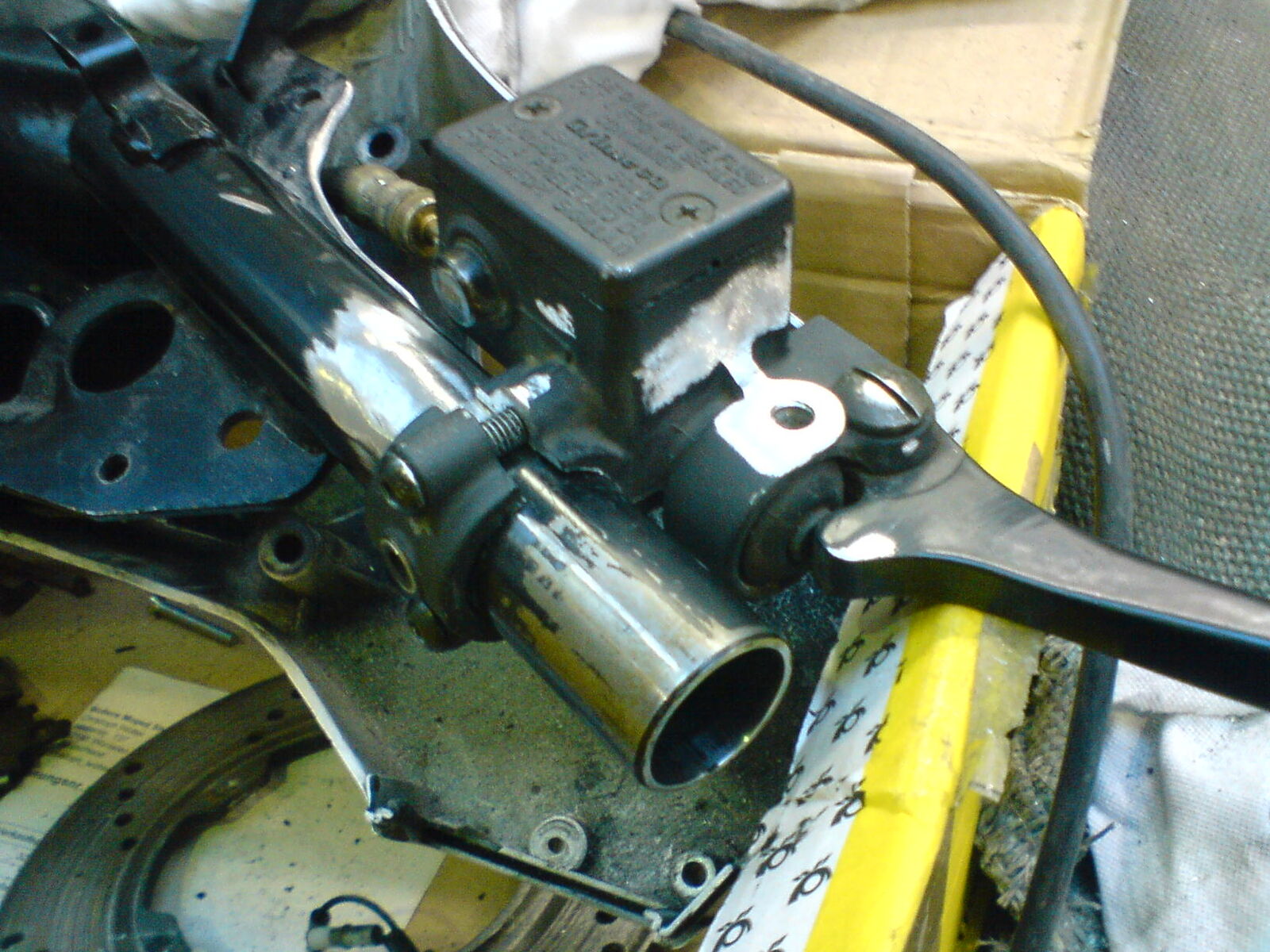 So heute war i wieder mal fleissig, orginale Bremshebelhalterrung entfernt, dann die neue Bremspumpe passend gedremelt, wegen dem anderen Rohrdurchmesser bei der Xl2, dann mal professorisch montiert, morgen kommt noch das Lenkeroberteil zum anpassen drauf.
