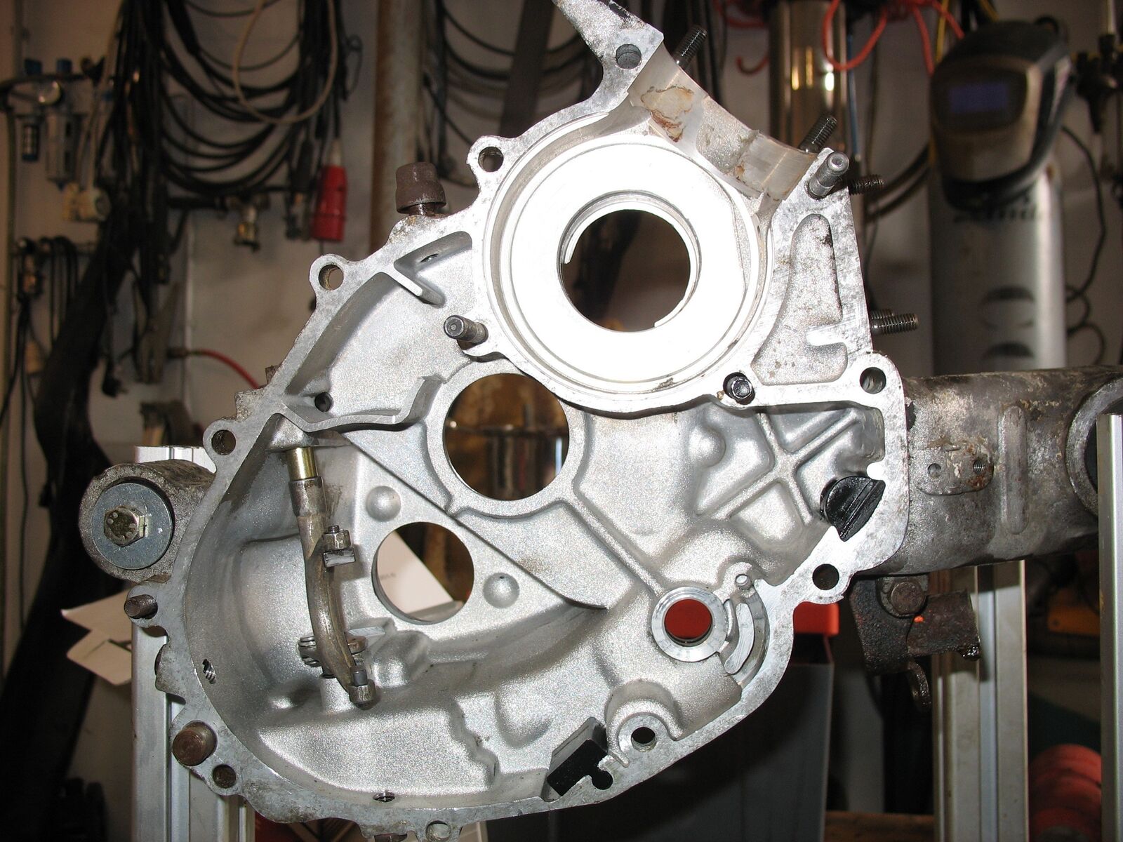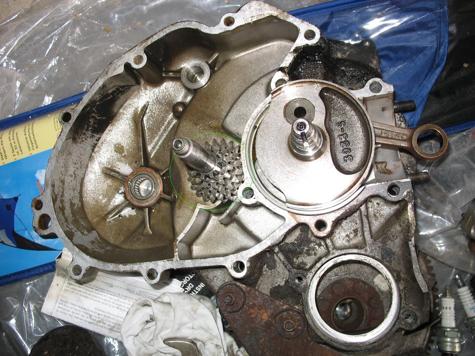 • 1. Das ist das Nadellager für die Hauptwelle. Ausbau entweder mit passendem Spezialabzieher, durch kaputtdremeln oder Mutter anschweißen, dann ein Flacheisen mit Loch über die Motorhälfte legen, so dass es auf der Dichtfläche aufliegt. Durch das Loch eine Schraube stecken, die lang genug ist, um die angeschweißte Mutter zu erreichen, dann Schraube anziehen und so das Lager aus seinem Sitz ziehen. Die Bezeichnung des Lagers sollte in den einschlägigen Onlineshops zu finden sein.