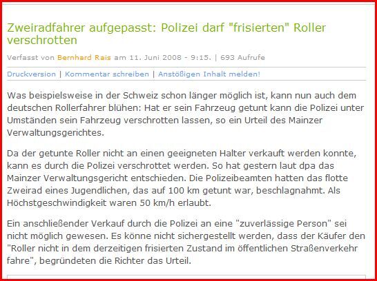 Hi, eins ist aber noch nicht geschrieben worden, es gibt zwischenzeitlich ein Urteil, in dem der Richter vefügt hat, das der sichegestellte Roller verschrottet werden muß. Weil nich sichergestellt werden kann, daß der wieder friesiert wird.