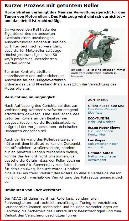 Naja, wenn du dir die Pressemitteilung des urteilenden VG Mainz ansiehst, lässt der Sachverhalt doch schon einige Besonderheiten erkennen, die keinesfalls eine generelle Verschrottung aller getunten Roller rechtfertigen würden. Den Wortlaut kopiere ich jetzt aufgrund entsprechenden Hinweises auf der Seite hier nicht rein, nachlesen kann aber jeder selbst unter diesem Link.