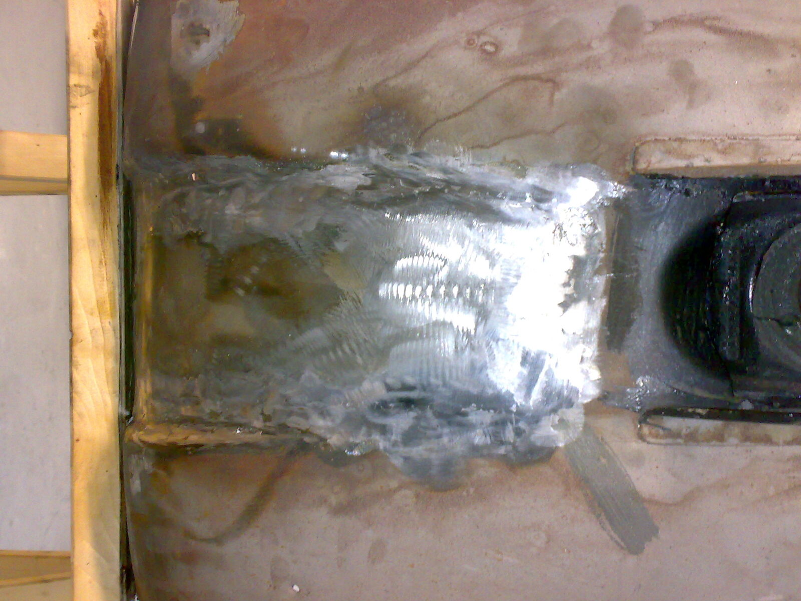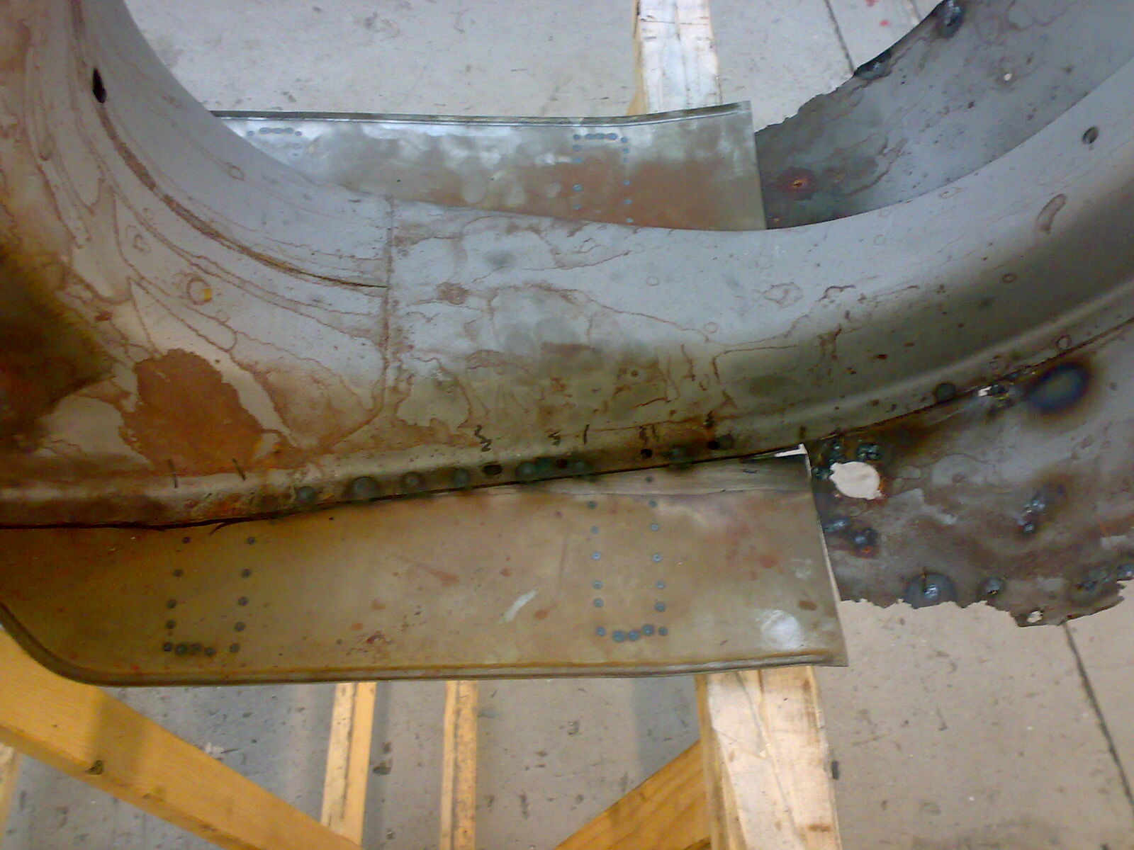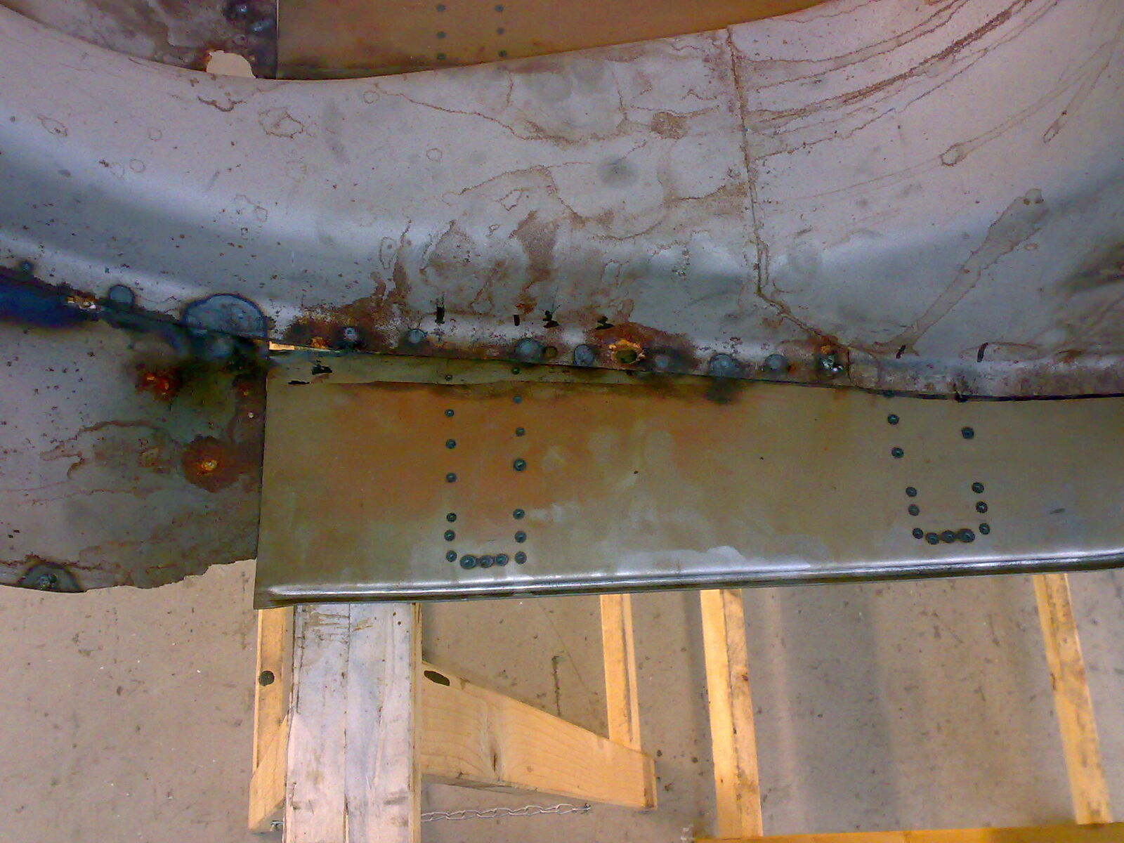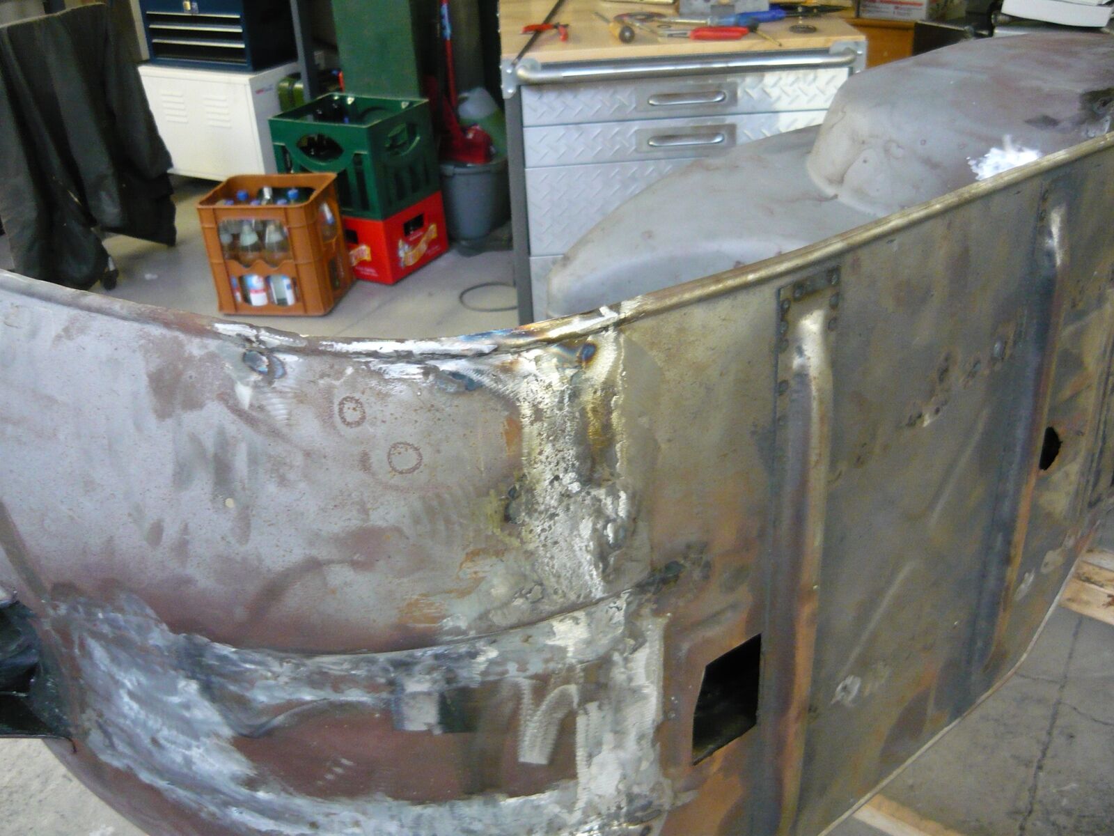 im gepäckfachbereich muss ich noch ein bisschen was zinnen, geschweißt ist auch schon. habe im bereich der sicke einen rundstahl eingeschweißt, da dort das blech sehr dünn war und ich spannungsrissen vorbeugen wollte. ist jetzt auf jedenfall hart wie beton. wie gesagt: bisschen zinnen, flexen, schleifen, spachteln und das wird ganz hübsch. hätte ich gar nicht gedacht, als ich den rahmen das erste mal gesehen habe. was doch ne blechschere, n hammer, n schweißgerät und ne flex so alles ausrichten können :)