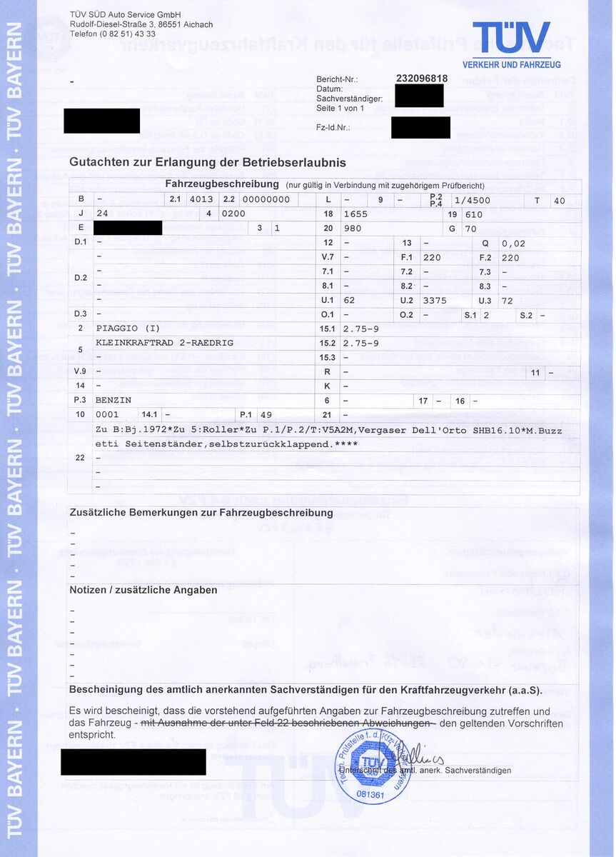 Hab ne 50 Special aus Italien ohne Typenschild. Das will der TÜV aber sehen. Hab mir also ein Blanko-Schild besorgt, bin aber nun etwas ratlos, welche Angaben da drauf sollen.