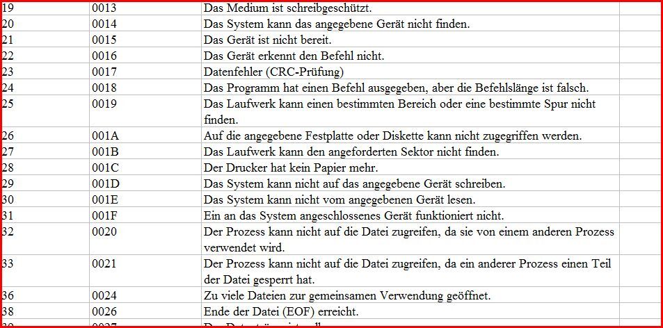 ich hab dir mal ein Teil der Fehlercodes angehängt. Wenn der HEX ist, besteht folgender Fehler, der Zugriff auf eine Datei ist nicht möglich, da gesperrt. Der kann auch mehrfach auftreten. Die genaue Datei ist nur durch Auswertung der Hexdumps zu ermitteln. Du hast zwar viel mitgegeben, aber es fehlt fast ALLES. Welches Windows ? welche Version? wann war die letzte Aktualisierung (Patches) ? und ganz wichtig was hast Du vor dem Fehler geändert oder eingebaut? Du kannst mal folgendes versuchen, Start unterbrechen, unter erweiterte Options, Einzelbestätigung auswählen. Dann jeden Vorgang einzeln bestätigen.
