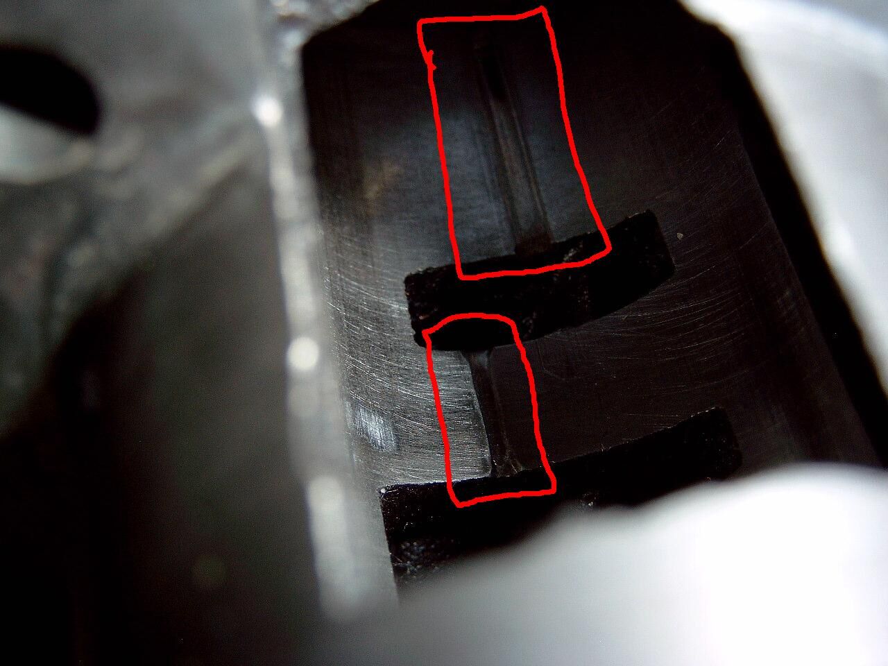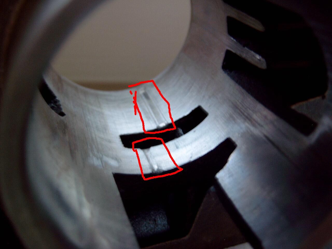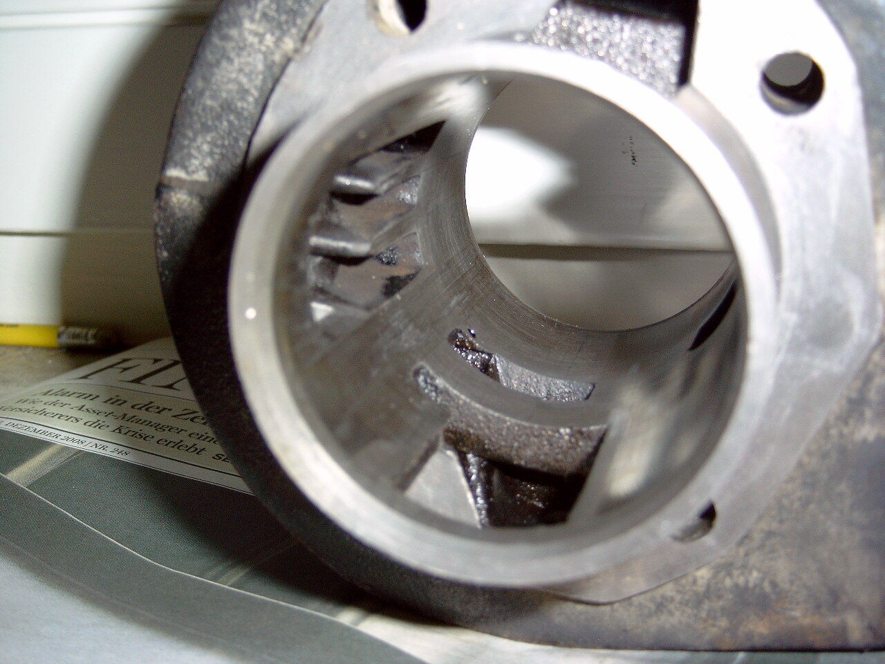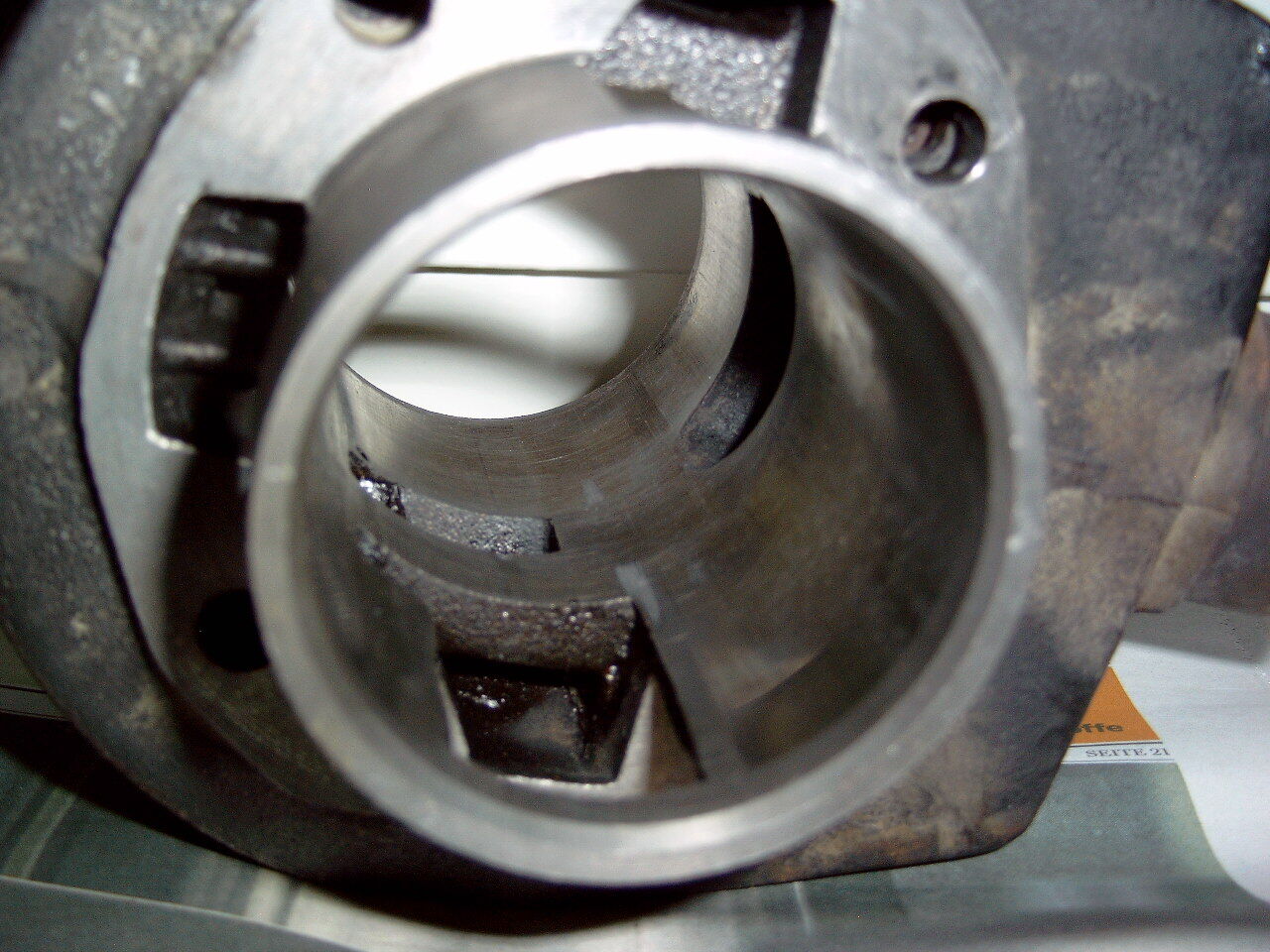 ich habe eben meinen ZMG Zylinder mit Kopf, aber ohne Kolben, für meine PX 80 erhalten. Leider hat er an 2 Stellen gut sichtbare Riefen, die ich auf den Bildern rot markiert habe. Ich habe bewusst die krassesten Bilder von den Riefen ausgesucht und mit ordentlicher Vergrößerung etc. fotographiert, um die Riefen hervorzuheben.