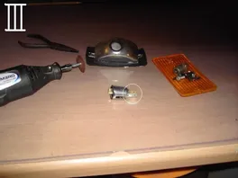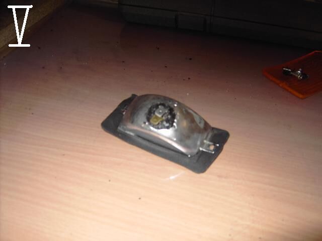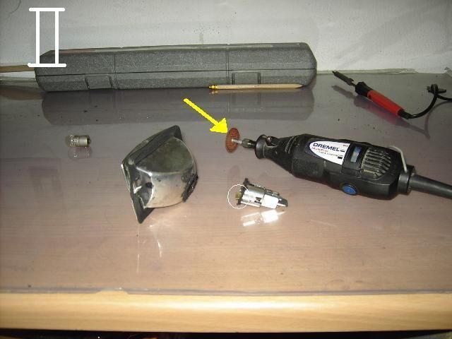 Hier seht ihr die benötigten Werkzeuge und einen ausgebauten Blinker. Neben dem Dremel benötigt man noch einen Lötkolben, die Drahtbürste ist ganz hilfreich um überstehendes Plastik zu entfernen und um den Kolben von verschmortem Kunststoff zu befreien. Man kommt aber auch ohne Drahtbürste aus.