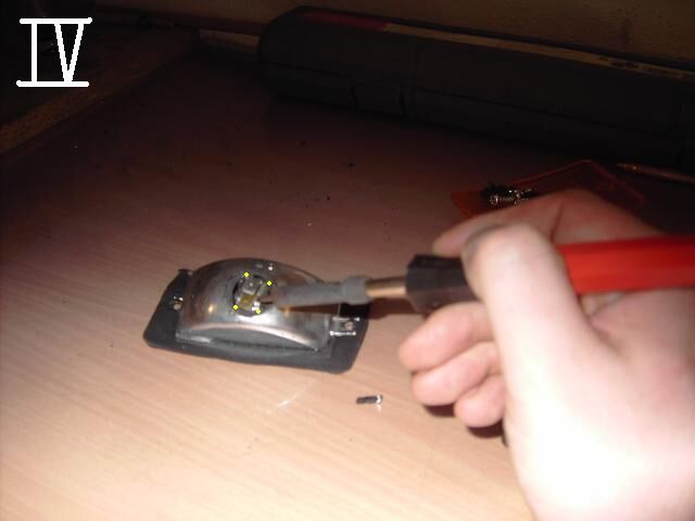 Jetzt wird die Fassung von vorne in den Reflektor gesteckt, sie wird nicht von der anderen Seite hineinpassen. Mit dem Lötkolben setzt ihr nun ein paar Schweißpunkte (gelbe Punkte), damit das ganze mal fixiert ist. Einfach nur ein Loch ins Plastik brennen bringt aber nix, das Plastik muss sich schon miteinander verbinden.