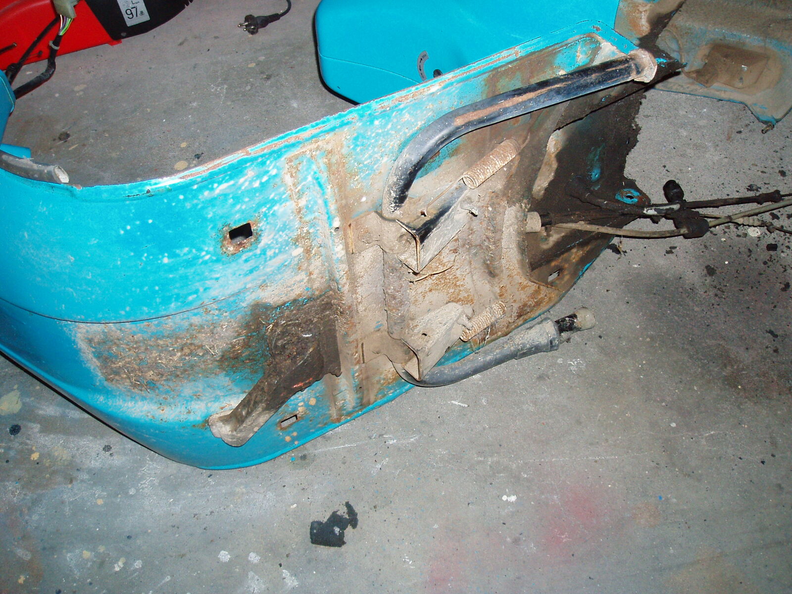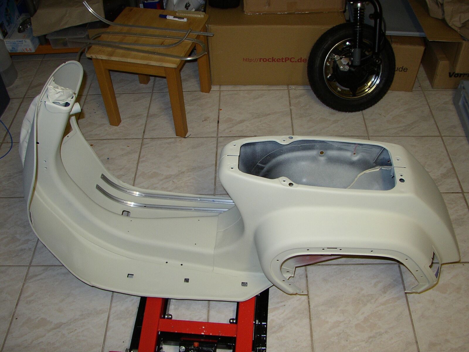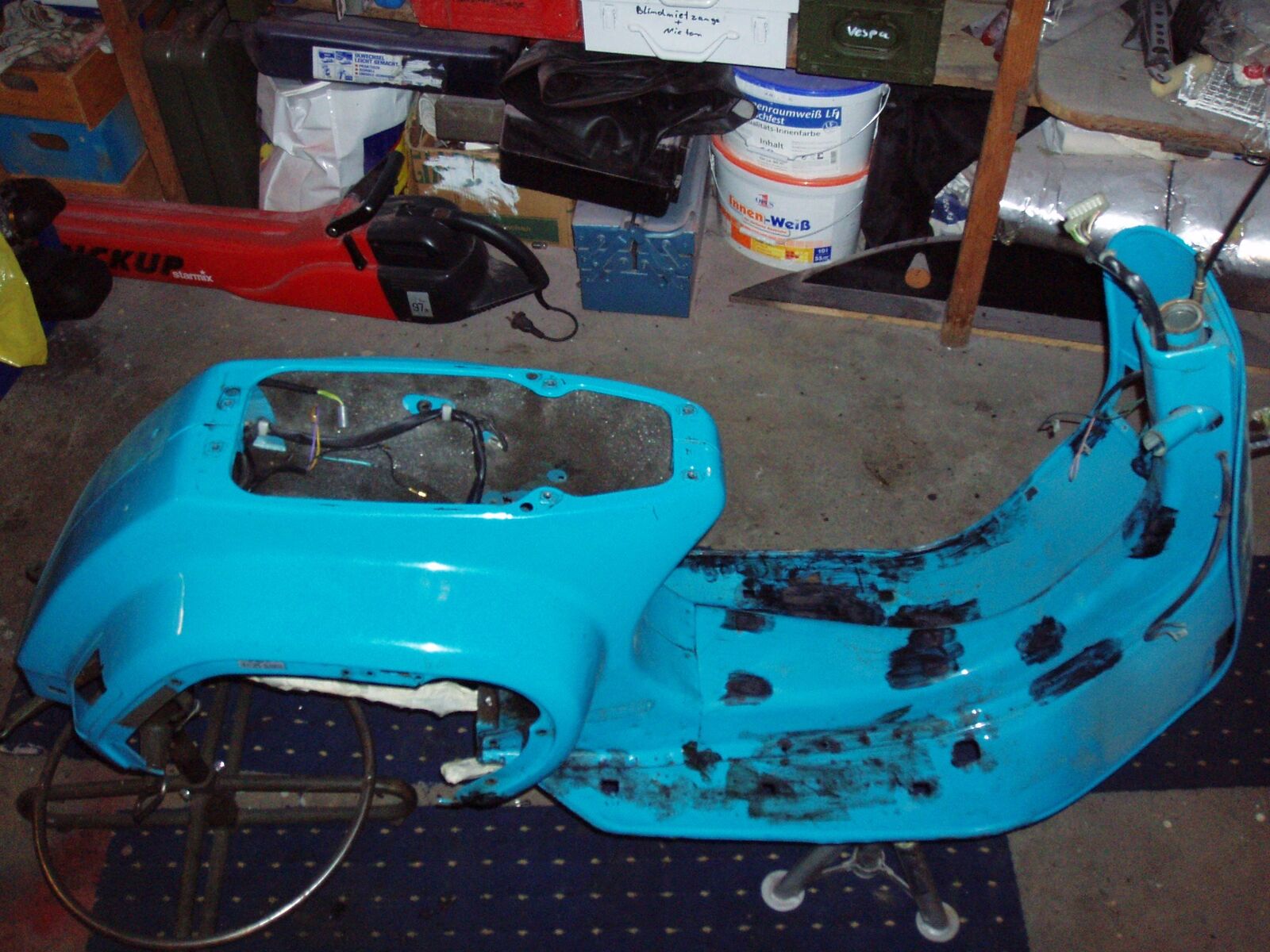 • so habe heute die spachtelarbeiten abgeschlossen !habe diese stellen gespachtelt weil alles schön klat sein soll und die verarbeitung und schweißpunkte von piaggio so tief sind das wasser drin stehen könnte genauso der übergang am rahmentunnel vom heck zum frontteil unterhal des bezinhahnes ist orgial nicht grade sehr schön verarbeitet!bei der xl2 mit gummimatten ist das egal weil mann es nicht sieht!aber ich will trittleisten montieren und deswegen habe ich das alles gespachtelt!!!war zwischendurch mahl krank und hatte auch viel stress arbeittechnisch(job)wollte eigenlich schon weiter sein !!nun gut alsnächstes wir gefüllert -grundiert!!!hier aktuellebilder vom 10.03.2009