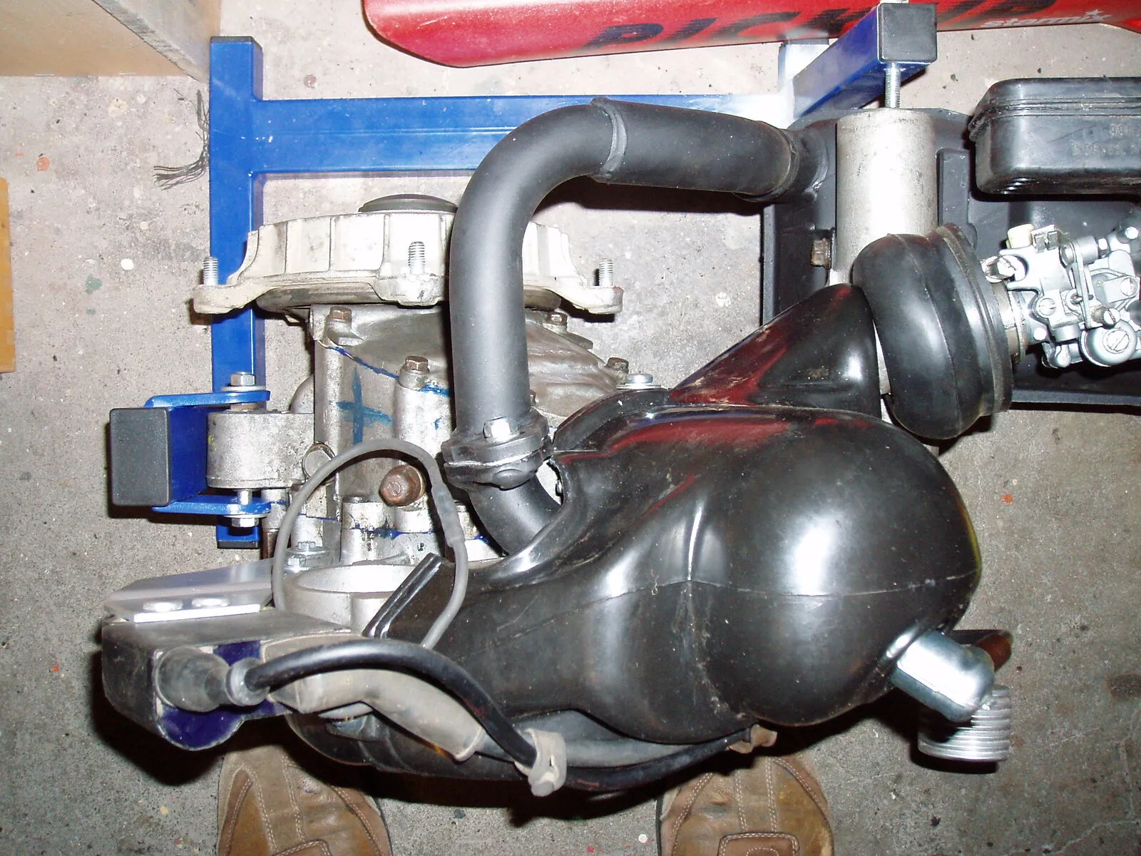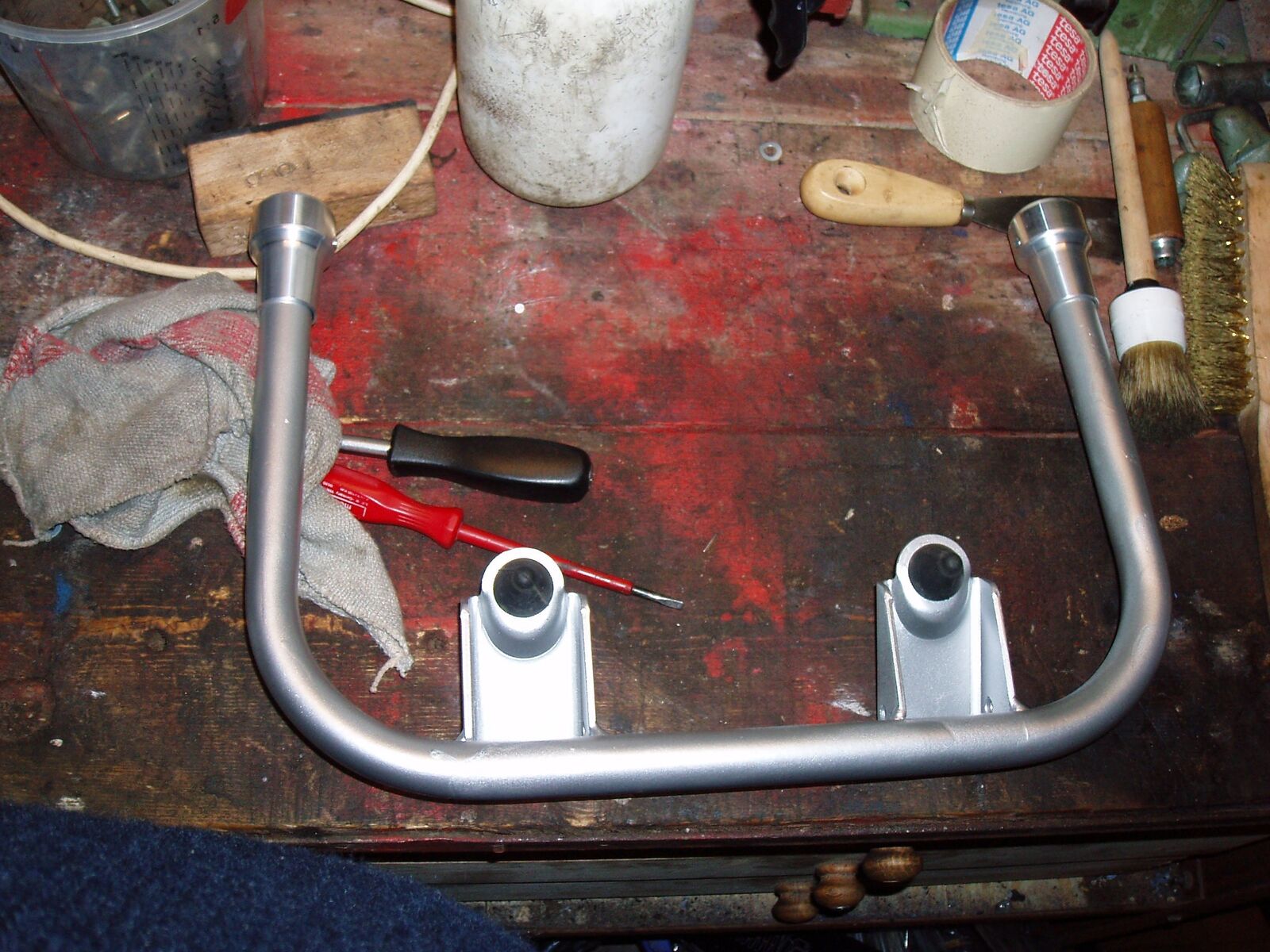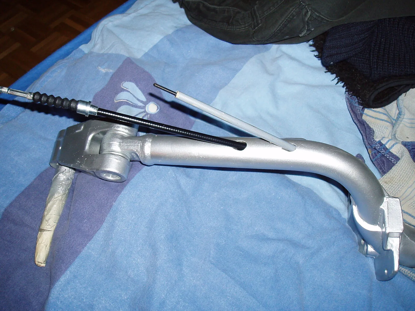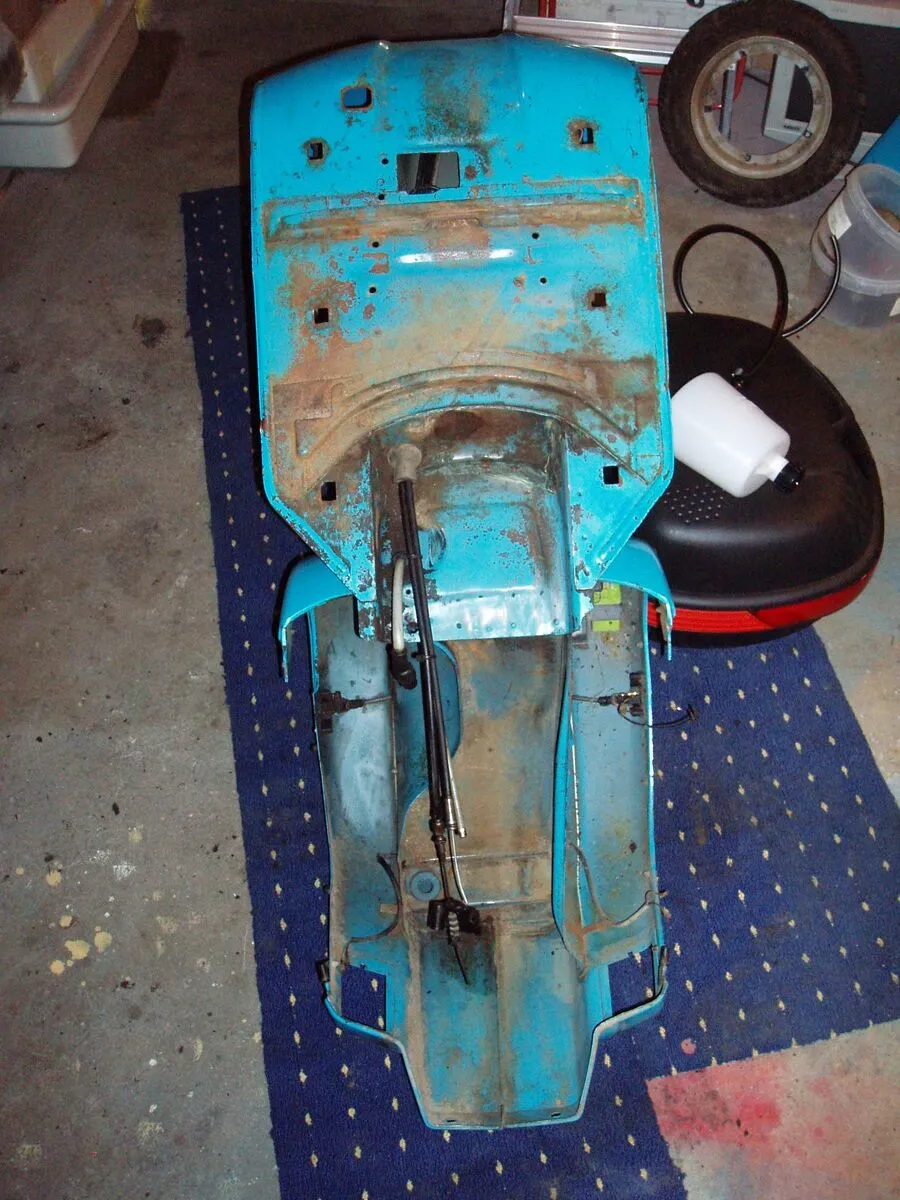habe die gabe und den motor fertig!!!die fußbremseinheit habe ich gesandstrahlt und nur mit klarlacklackiert !so bleibt der alu lock erhalten!die gabel so wie die anderen kleinteile habe ich auch gesandstrahl grundiert und lackiert! der rahmen ist mit rostumwandler behandelt(Novorox) die löcher für die fußmatte in der mitte (4 schraubenlöcher)habe ich zugeschweißt ,werde dann trittleisten anbauen!ich denke so in 3-4 wochen geht alles zu lackierer!wahrscheinlich so ein blauton!dunkel -helblau bin mir da noch nicht sicher!!
