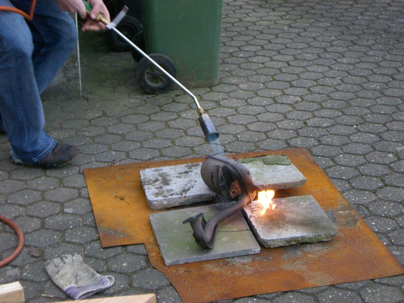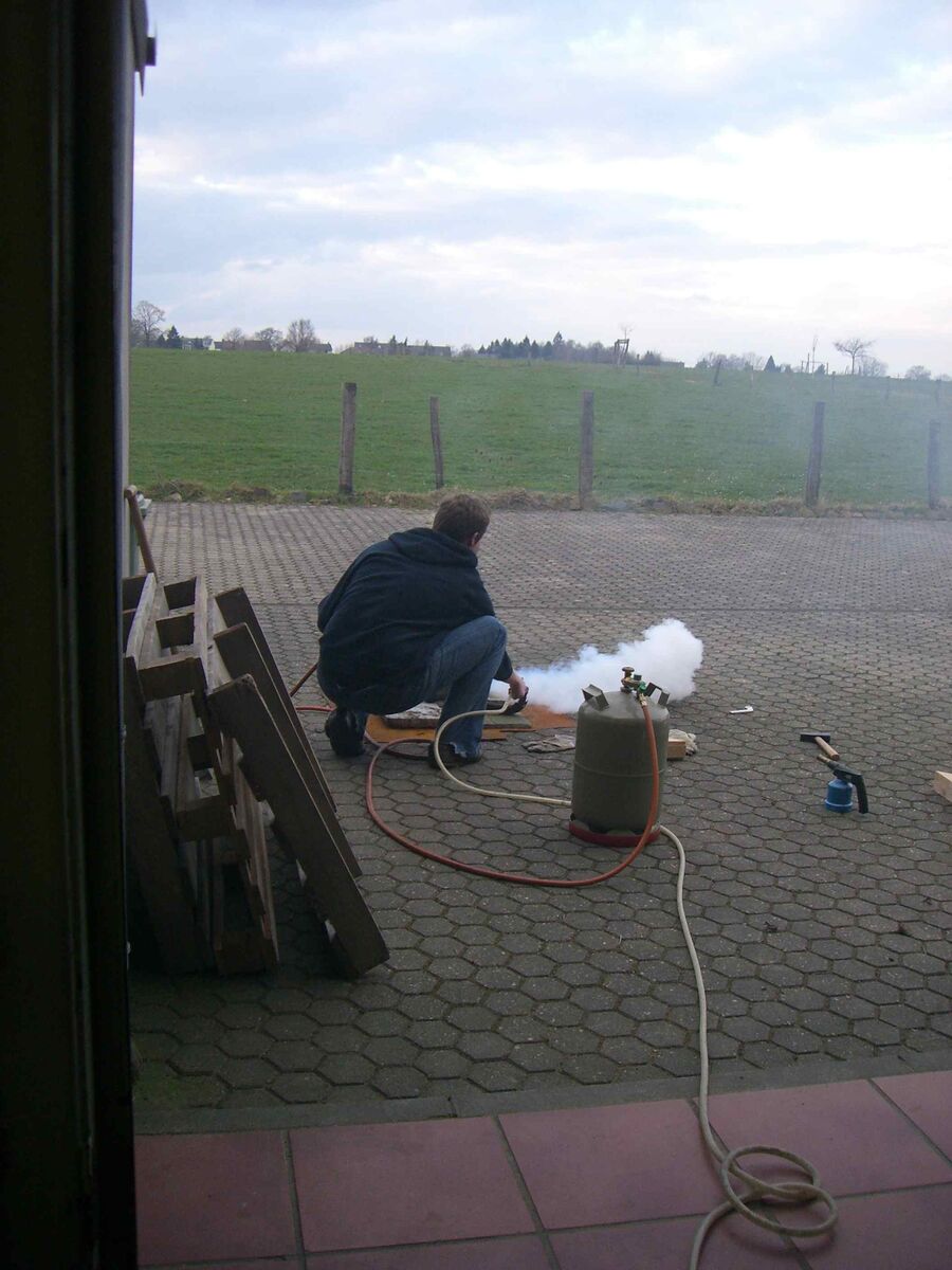 Volle Flamme auf den Pott! Mit dem riesen Brenner den ich hatte gings richtig ab! Habe das ganze so eine weile fortgeführt und ab und zu mit einem Holzstück draufgekloppt!