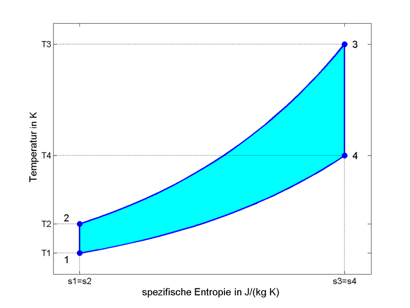 • Hallo, nur mal erhellendes zur Theorie des Otto-Motors. Ich habe hier mal ein Diagramm(T-s) aus der Wikipedia angehängt. Die Temperatur im Punkt 1 entspricht der Umgebungstemperatur, bzw. der des angesaugten Gemisches + der Umgebung(Zylinder,...). Die türkise Fläche ist gleich der Arbeit die der Prozess(in unserem Fall 2 Takte) leistet. Wenn nun die Temperatur im Punkt 1 niedriger ist, so wird die türkise Fläche und damit die geleistete Arbeit größer(mehr Leistung). Das selbe kann man natürlich auch erreichen, wenn man die Temperatur in den Punkten 2(Verdichtuingstemp.,z.B. höherer Druck durch bessere Kompression oder Aufladung) und 3(Verbrennungstemp.,durch heisser verbrennenden Treibstoff) erhöht. So theoretisch ist das ganze meiner Meinung nach recht verständlich.