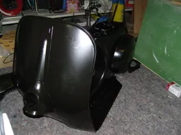 als erstes kammen alle lackierten teile in ein säuredampfbad und wurden entlackt, mit großer überraschung gab es keine durchrostung und bis auf eine riesen delle am seitenteil die vorher nicht sichtbar war sah sie sehr gut aus, rostschutzöl drauf und weiter gings zu einem schon im ruhestehendem schmied, der die delle nach fast einer stunde und unzähligen fluchen so gut wie raus hatte.