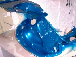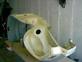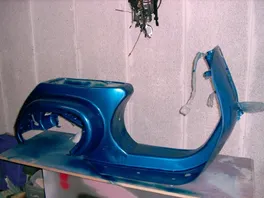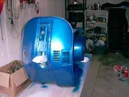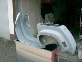 Der Rahmen ist jetzt soweit fertig, muß nur noch poliert werden und dann der Kantenschutz dran. Hab dann heute die Lüfterradabdeckung und das Handschuhfach lackiert und noch ein paar Kleinteile gesäubert. Morgen wird dann (hoffentlich) "geheiratet".