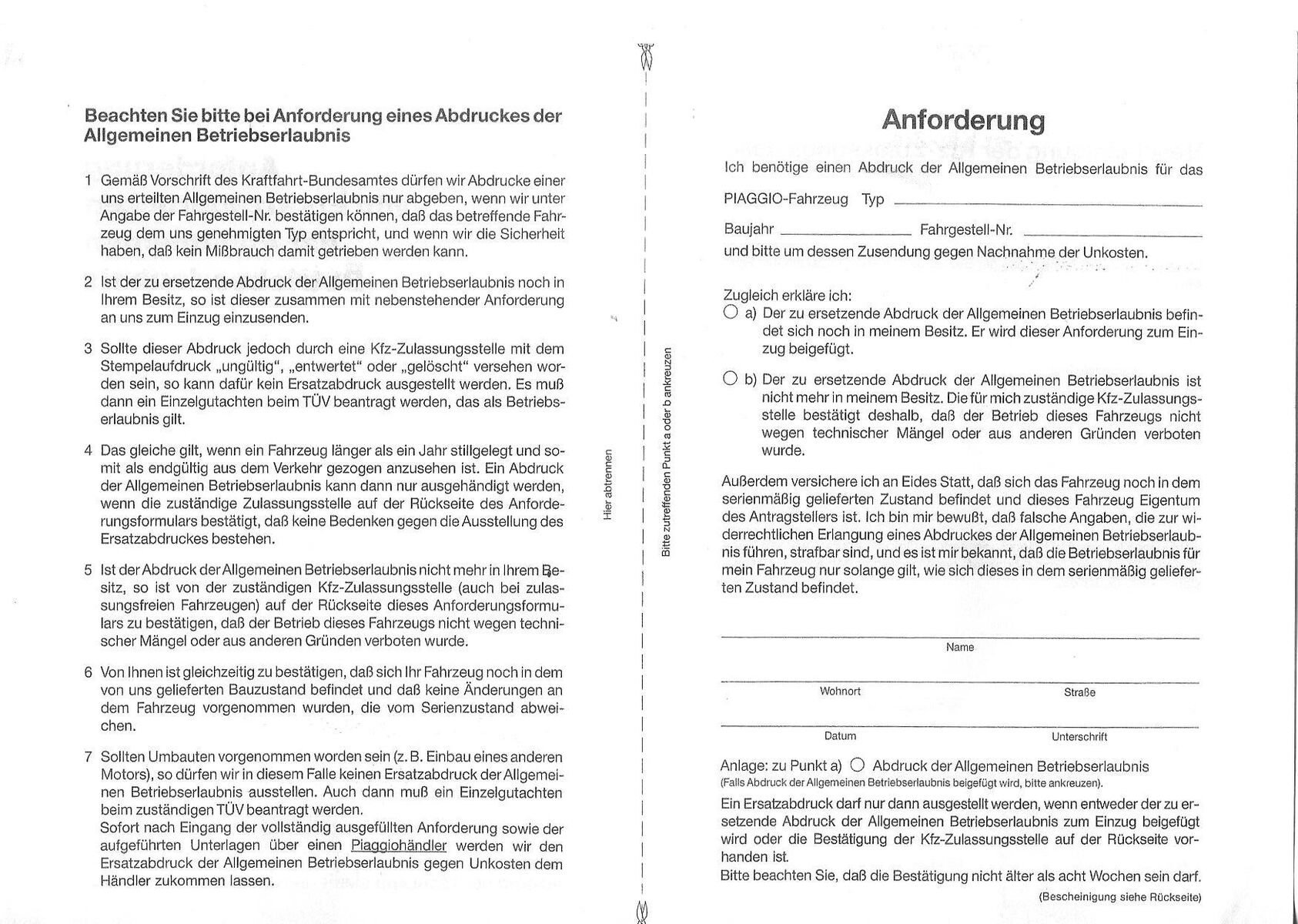 da die Papiere meiner kürzlich gekauften 50 Special (V5B3T) vom Vorbesitzer nicht mehr gefunden wurden, habe ich einen Ersatz bei Piaggio angefordert. Das ganze läuft ja über den Händler, ich musste die Anforderung vorher von der Zulassungsstelle abstempeln lassen. Hatte die Prozedur bei einem anderen Fahrzeug schon mal gemacht. Nun bekam ich vom Händler die Nachricht, eine Ausstellung einer BE sei nicht möglich, da das Fahrzeug nicht in ihren Unterlagen gelistet ist. Es handelt sich aber um ein deutsches Fahrzeug (deutsches Typenschild), nummerngleich und mit Blinkanlage.