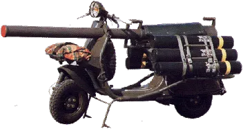 Das französische Militär bekam 1952 von der Firma A.C.M.A. (Ateliers de Construction de Motocycles et Accessories) spezielle Vespa-Modelle zum Test. Man erprobte diese Vespa im Vergleich mit anderen Rollern auf die Transportfähigkeit, den Abwurf mit einem Fallschirm aus dem Flugzeug Gruppenfotosowie die Montage einer Kanone oder Panzerfaust samt Munition. Der Sohn des Vespa-Konstrukteurs Corradiono D'Ascanio, Ingegnere Giorgio D'Ascanio, half der französischen Zweigniederlassung bei der Weiterentwicklung dieser Militärvespa. Das französische Milit�r bestellte bei der Firma A.C.M.A. dann diese Vespa, von welche zwei Modellvarianten bekannt sind: T.A.P. 56 und T.A.P. 59. Die Zahlen bezeichnen gleichzeitig das entsprechende Baujahr. Der Motor hate einen Hub von 54 und eine Bohrung 58,5mm. Der grössere Kolben ermöglichte das die Ladung auf dieser Vespa bis 250 Kilogramm sein konnte und immernoch durch schwer fahrbares Terrain rollen konnte.Peng! Auf den Bildern ist speziell der Sitz, die Bügel und die Aussparung im Beinschild f�r die Kanone oder Panzerfaust zu beachten.