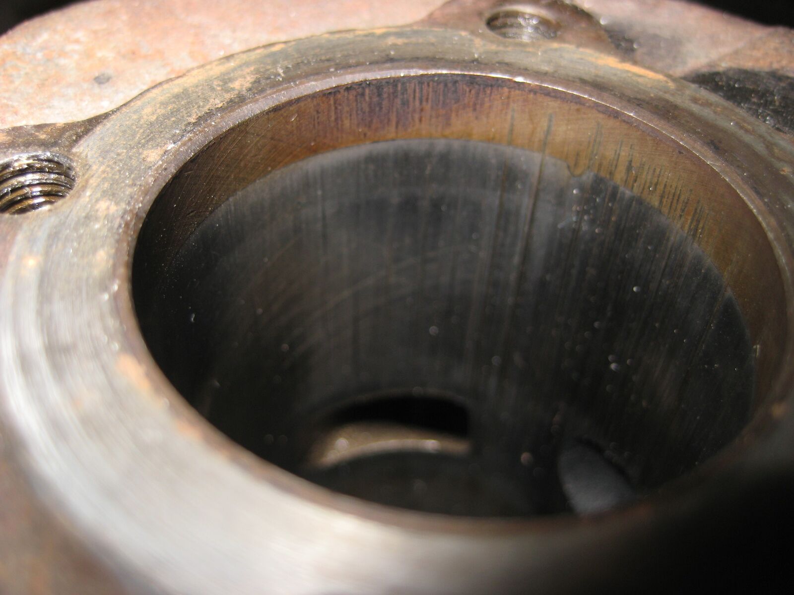 Der Innenraum sieht recht O.K. aus-so sehen bei mir die älteren Zylinder auch schon mal aus,kommt halt von der Verbrennung im oberen Zylinderbereich-aber nur,wenn die Fläche "Anlaßfarbe" hat,d.h. die Fläche (das Metall) verfärbt sich bei Hitze .