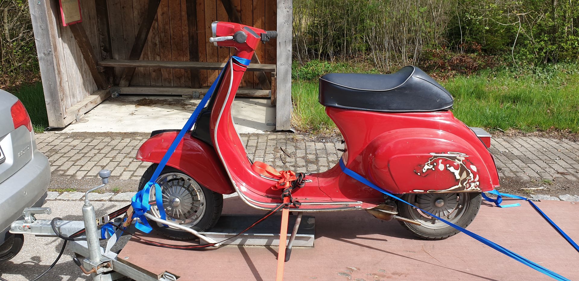 Zum einen tut das der Vespa nicht gut, zum anderen und viel wichtiger noch, ist das so auch nicht wirklich sicher. Wenn sie frei steht, federt sie durch das Spannen der Gurte ein und steht bombensicher.