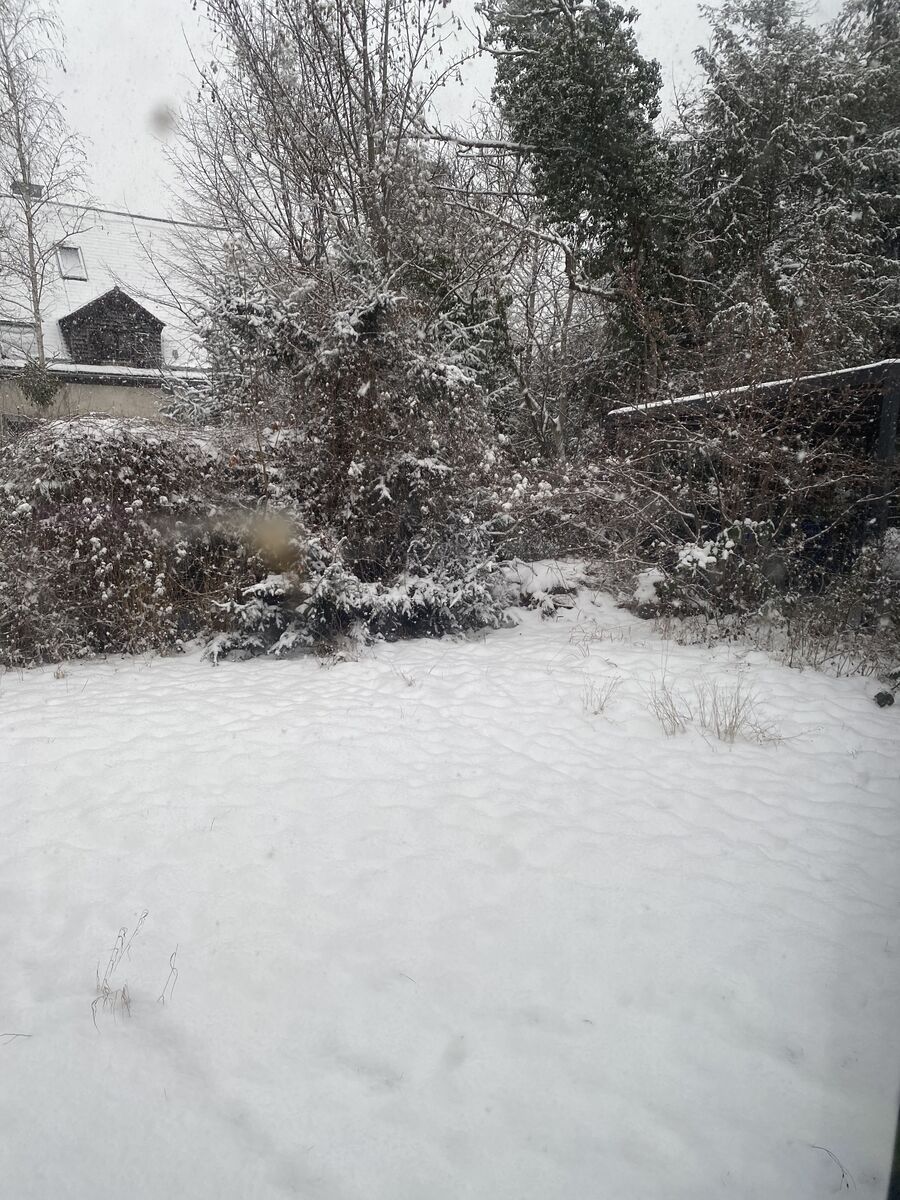 Hier gestern leichter Frost, den nassen Schnee hat es an den Bäumen festgefroren und wo er von Spaziergängern verdichtet worden war gibt es glattes Eis.