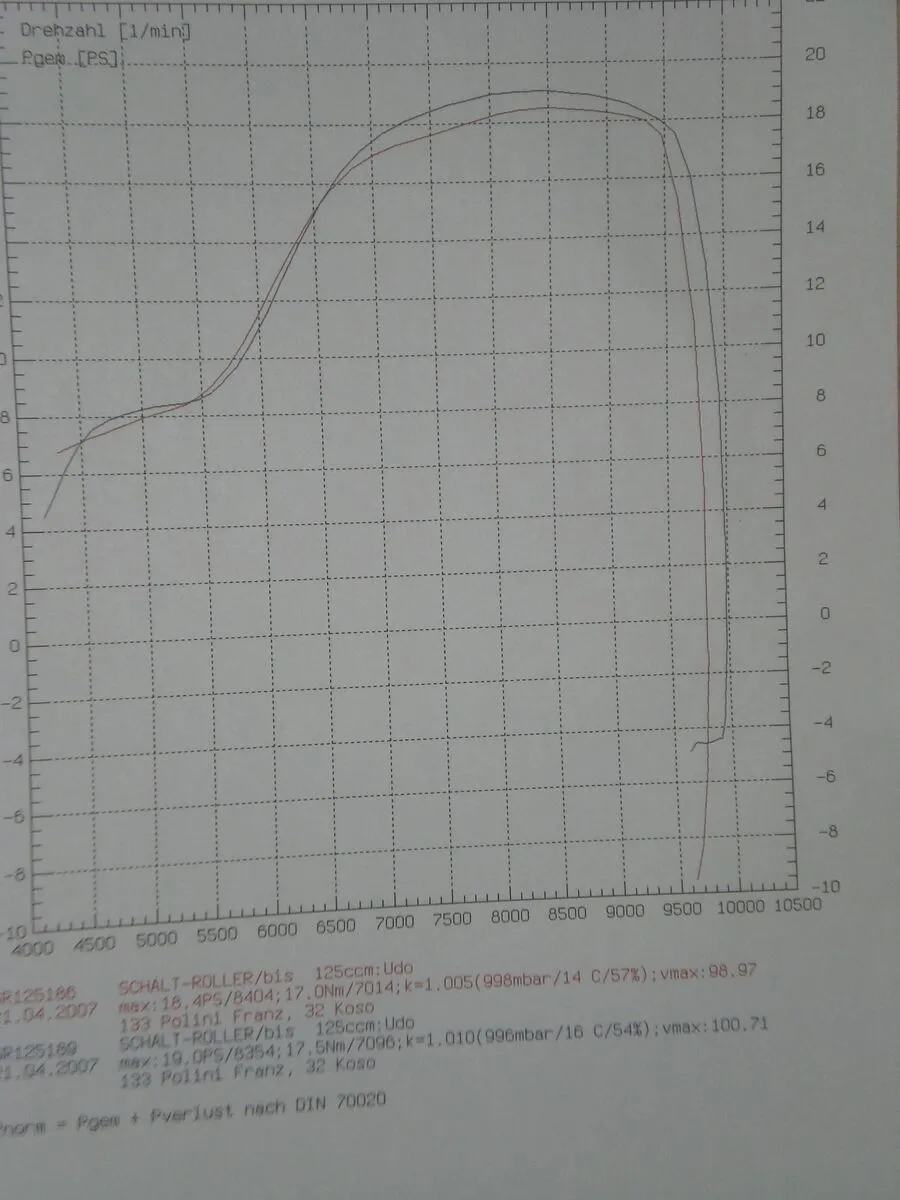 Bei meinem ersten Prüfstandslauf standen 18, 4 Ps an, Clip wurde dann einen runter gesetzt, was zur folge hatte das es Band schlechter wurde, beim zweiten Lauf wurde die Zündung auf ca. 20 Verschoben, folge war 0,5 Ps weniger, Zündung dann auf 15-16 Grad und schon standen 19 PS an, Prüfstand dauerte daher nur ca. 1,2 Stunden und war ein voller Erfolg.