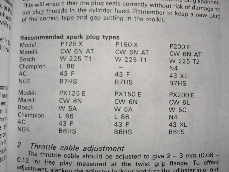 habe eine Zündkerzentabelle gefunden,da steht auch drin ,das ich die B7ES für die PX 200 verwenden sollte,habe ich auch getan,war heute nach 8 Jahren beim Tüv und siehe da,alles OK,ohne Probleme wieder 2 Jahre Ruhe.