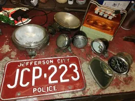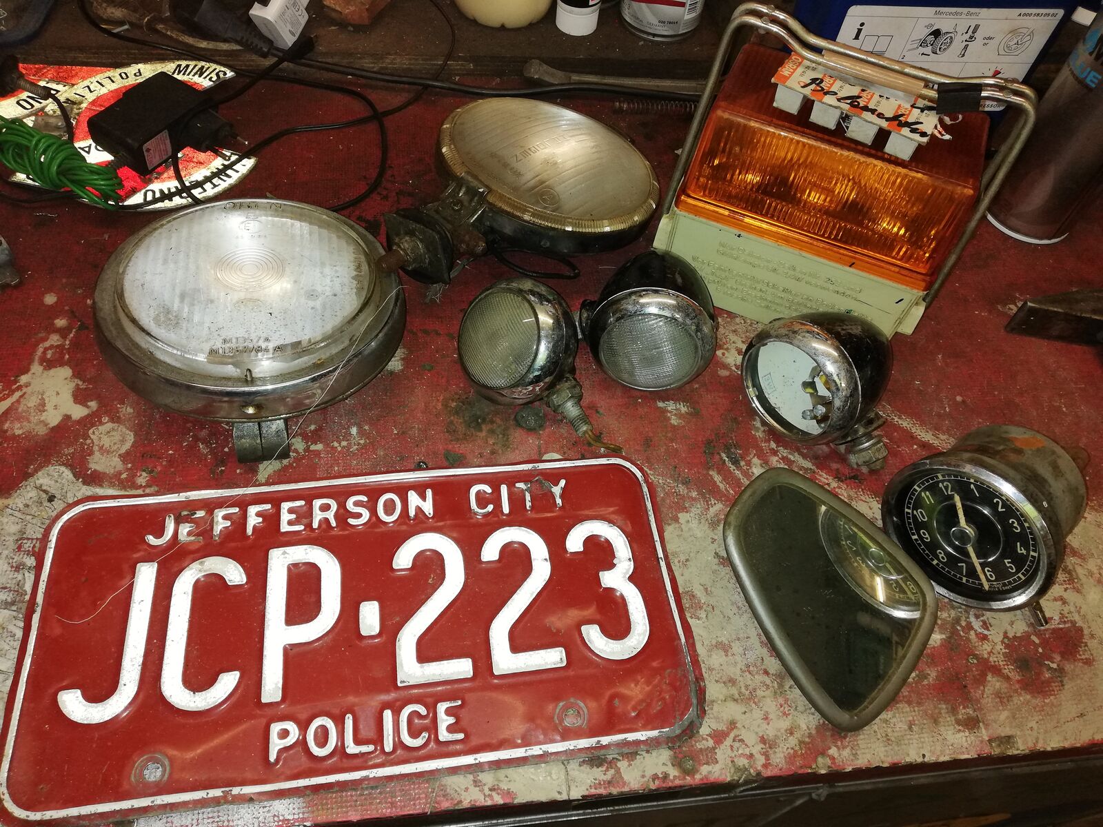 2 Alukisten und Scheinwerfer, Signallampe,Polizei Schild aus Missouri und nen alten Rückspiegel. Und ne Kienzle Lkw Uhr