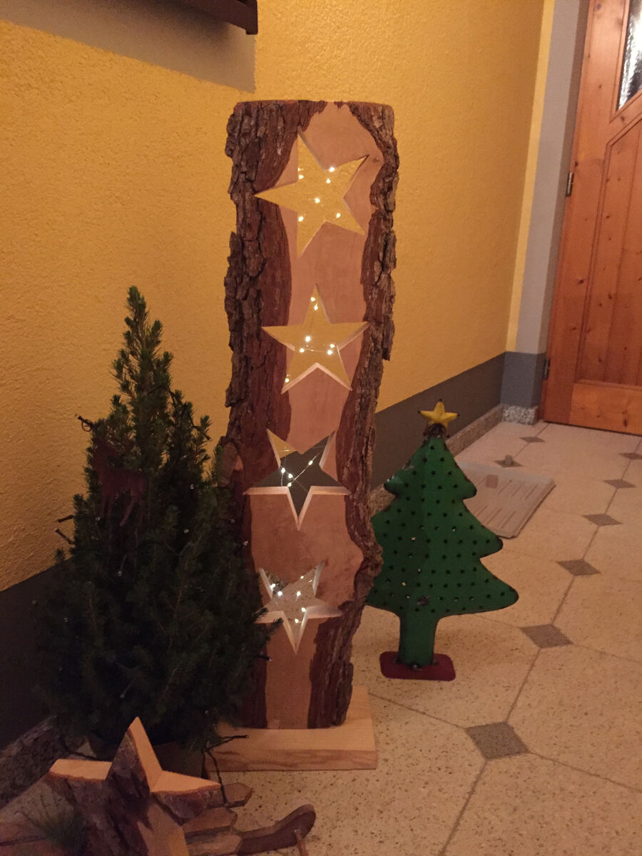 Sägerauhe Bretter , geflammt dann Sterne reingeschnitzt 4 Stück davon und noch ne LED Glühlampe mit Farbwechsler rein , fertig ...