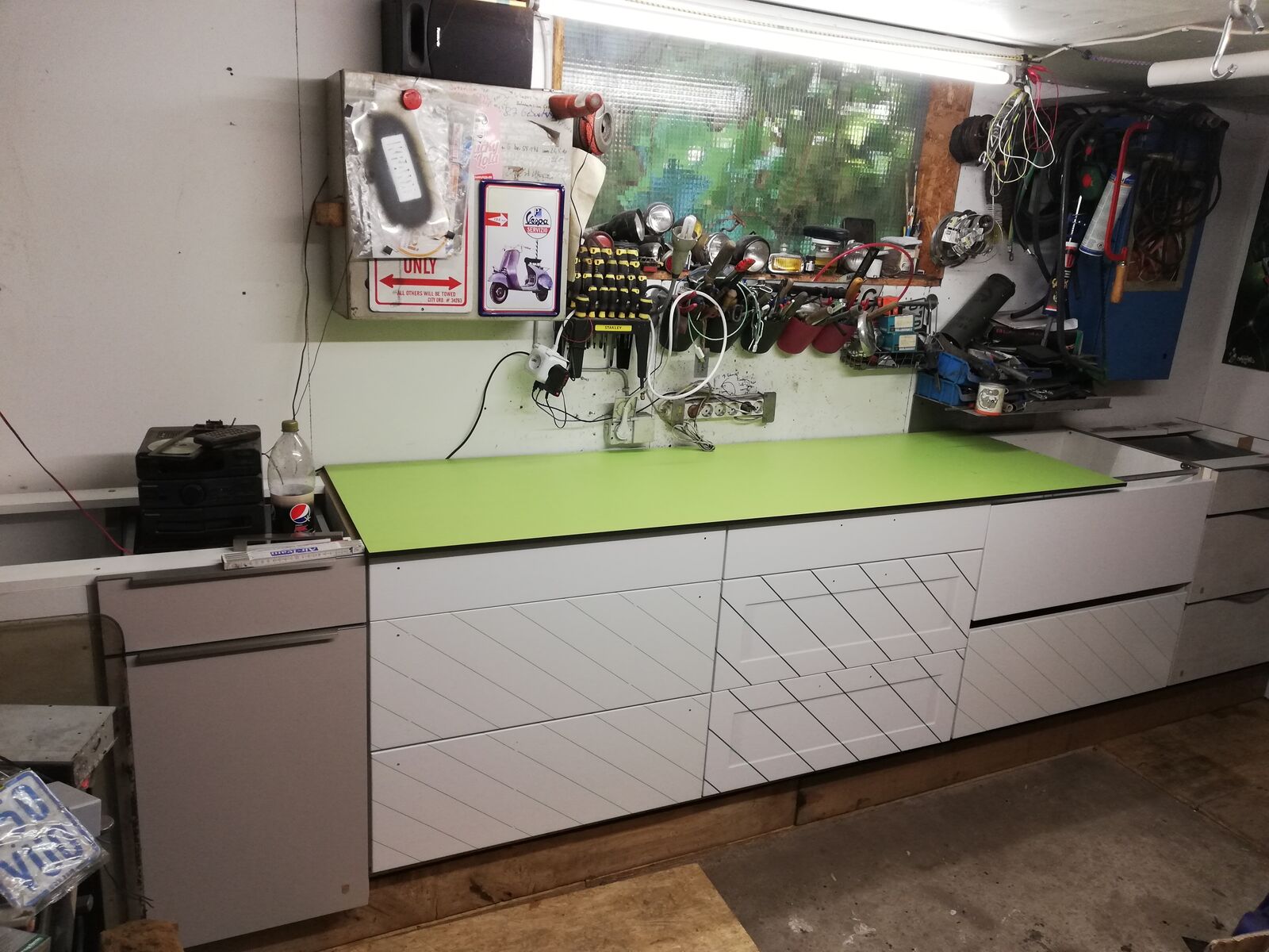 Musste 4 m zusammen bekommen. Fronten waren mir egal wie die aussehen. Sind stornierte Schränke. Die können wir inner Firma dann kaufen. Leider habe ich von der grünen Fassadenplatte nur eine. Aber 2 rote habe ich noch. Die kommen dann als Arbeitsplatte drauf. Sau hart das Zeug
